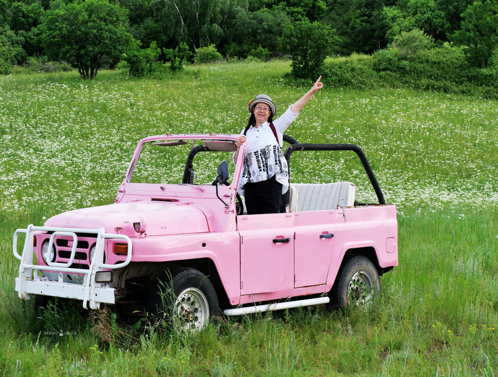 我很喜欢草原上的网红打卡区,霍比特小屋,粉色的吉普车,红色拖拉机,黄色推土机,光头强,蘑菇屋,都是不错的拍照地,在这里仿佛演绎一场童话故事。