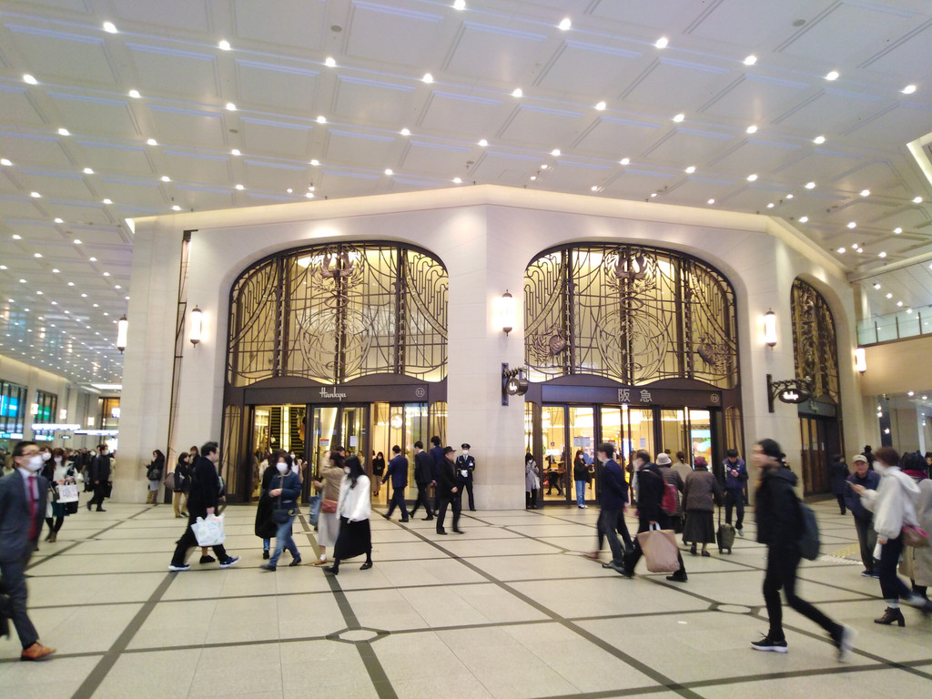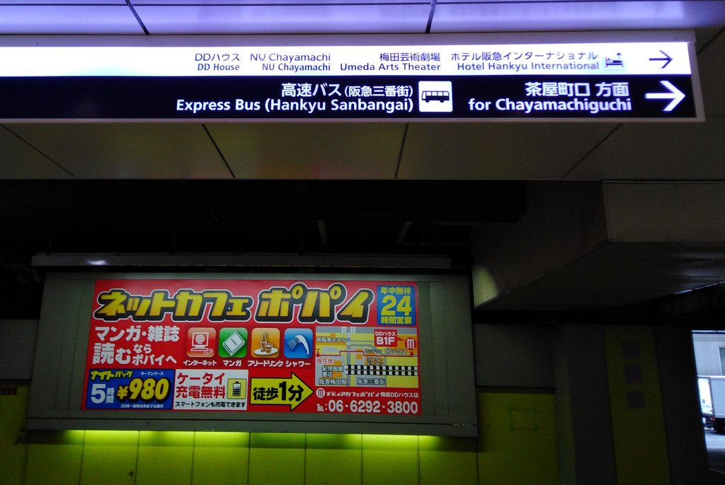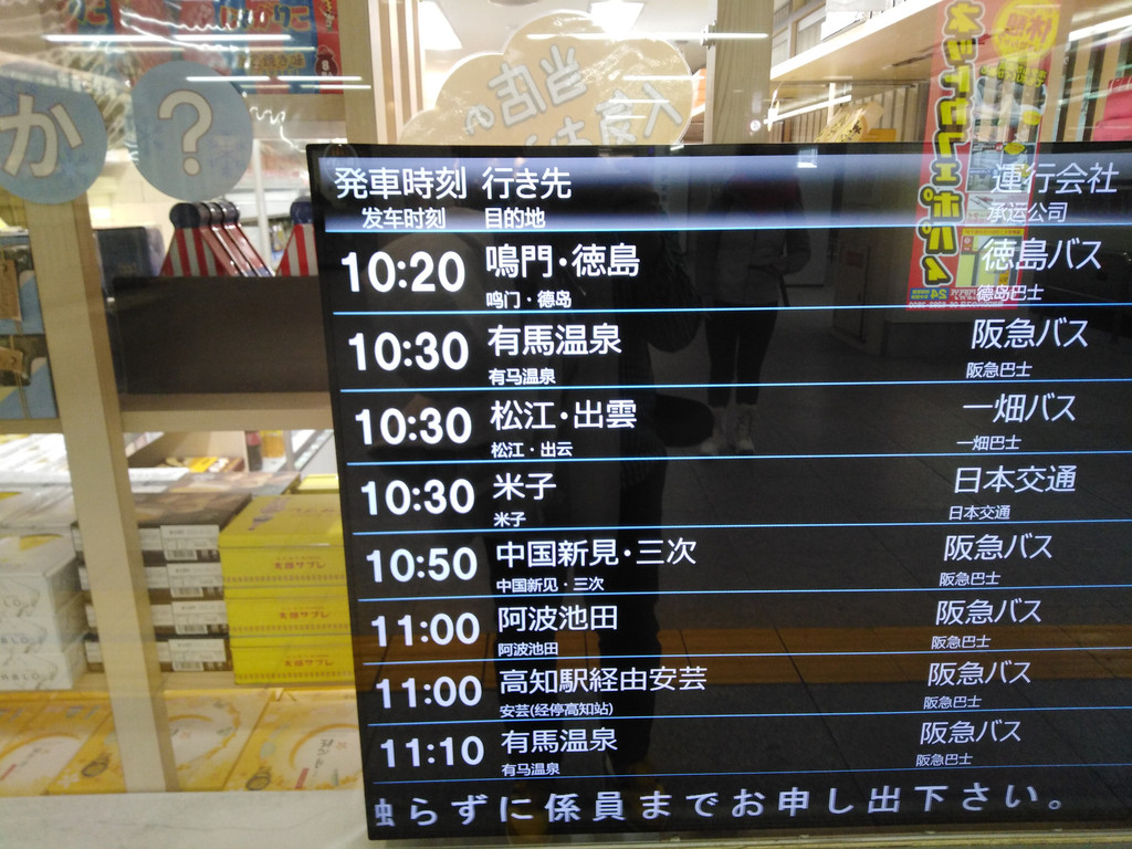 在阪急三番街坐“阪急巴士”前往有马温泉(1400日/人,约1小时)。阪急三番街在梅田站的北面,出站后朝下图标志走。