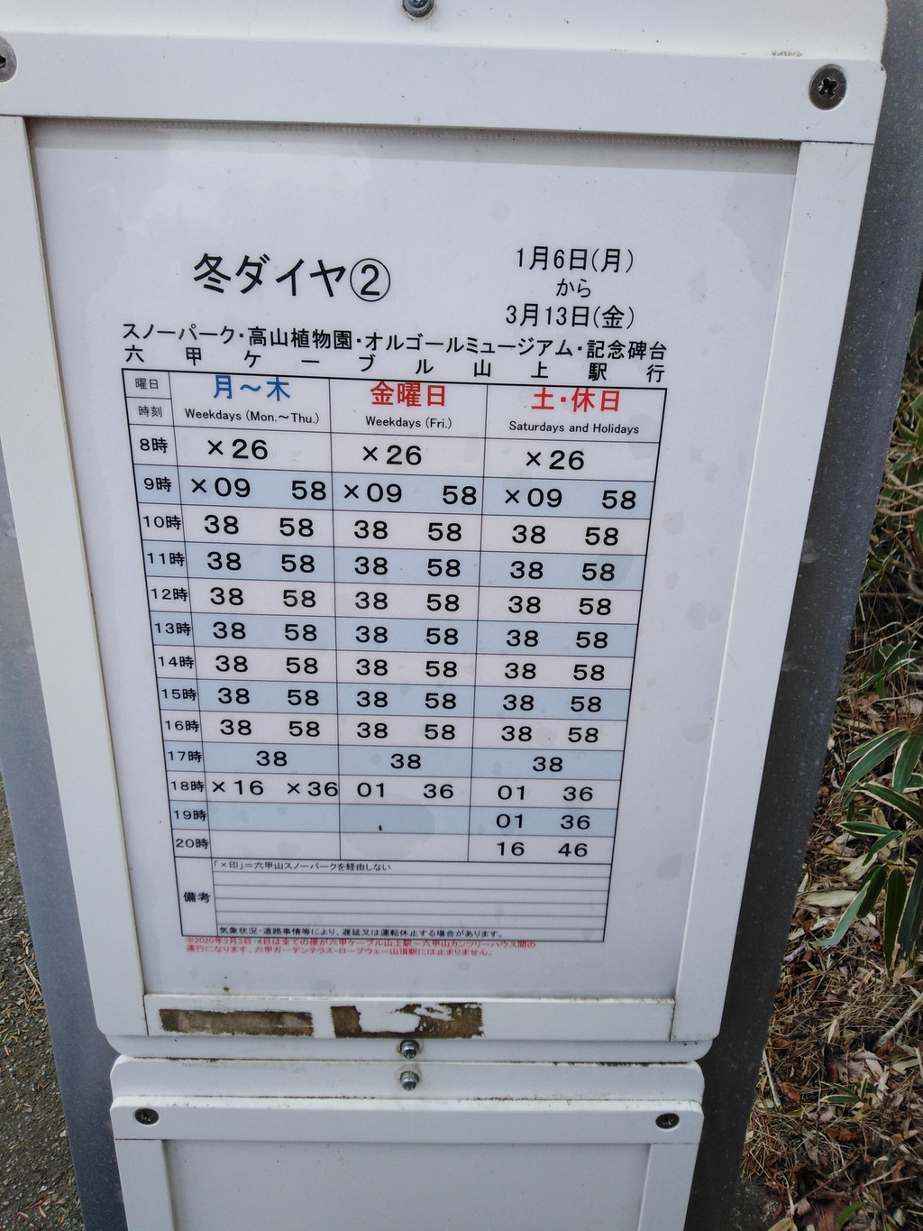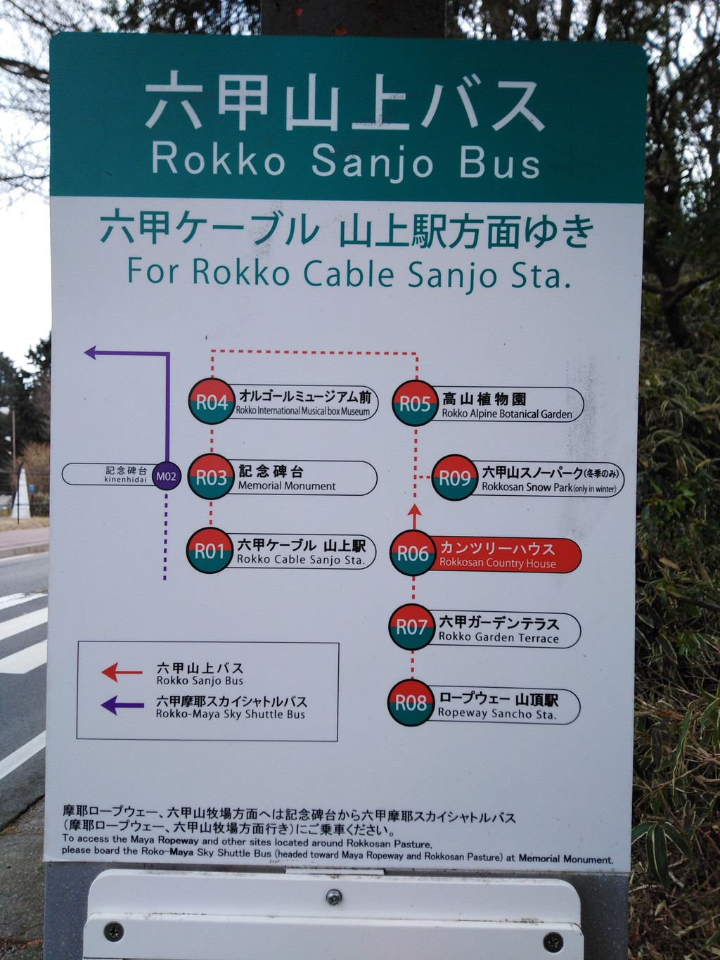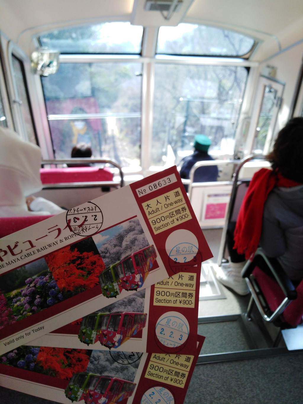 在乐园门口坐六甲山巴士(R09站,乘坐时要注意行车方向,非冬季往上面走一点就是R06)到六甲山上駅站(从有神户市区上到六甲山上的缆车站,对应R01站)260日/人,旁边就是摩耶山巴士总站(也可以在R03换乘M02,但在总站更稳妥一点),司机大叔很热情,帮我们换零钱和教我们在哪里下车,到了天上寺站(470日/人)还在车门处指引我们到酒店的路口。