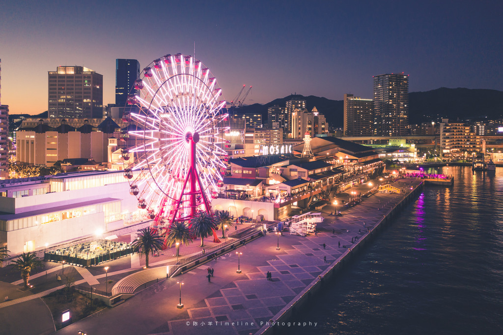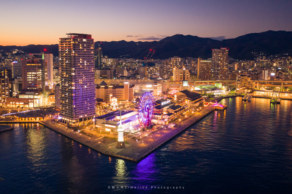美妙的神户港夜景,远方是神户市中心鳞次栉比的高楼。