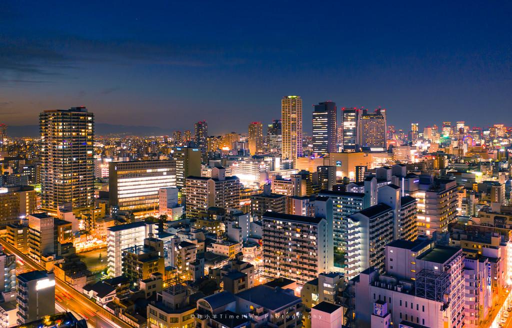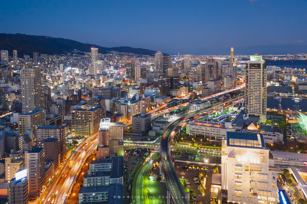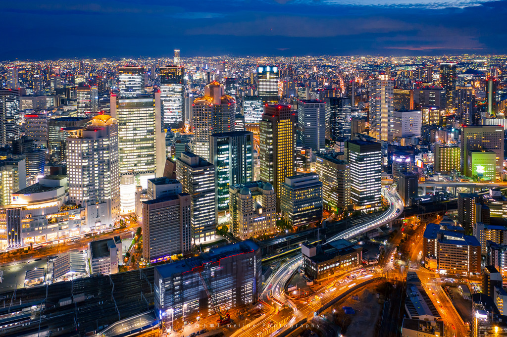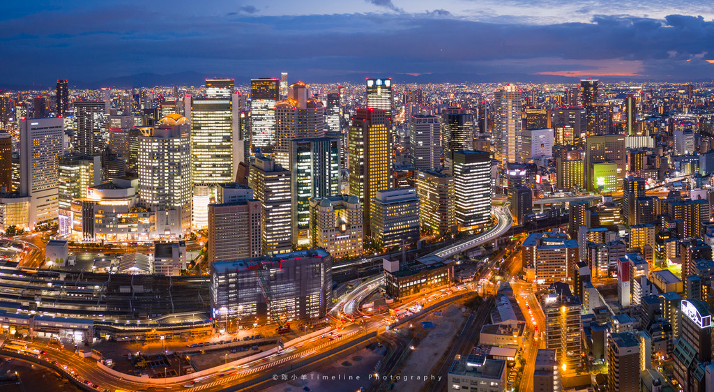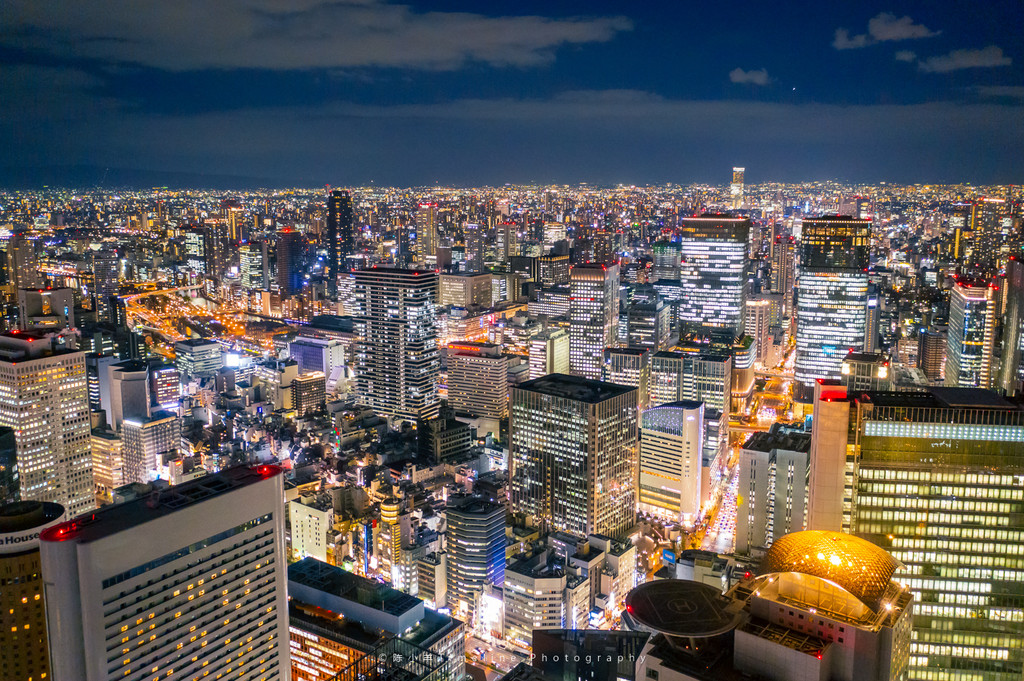 在这里等待日落拍摄夜景。梅田是整个大阪最具“曼哈顿”气质的区域,密集的摩天大楼群,在华灯初上之时,尽显大阪的现代化和繁华。