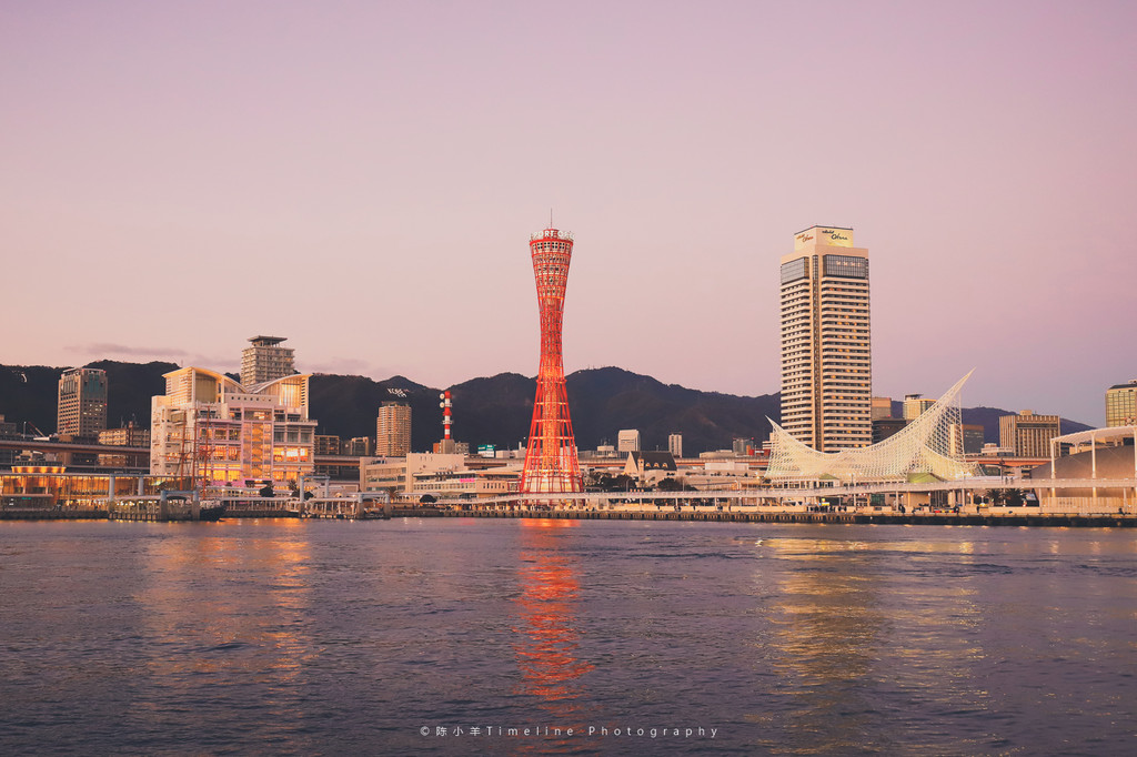 夕阳落下,天色还未完全暗下来的神户港塔。