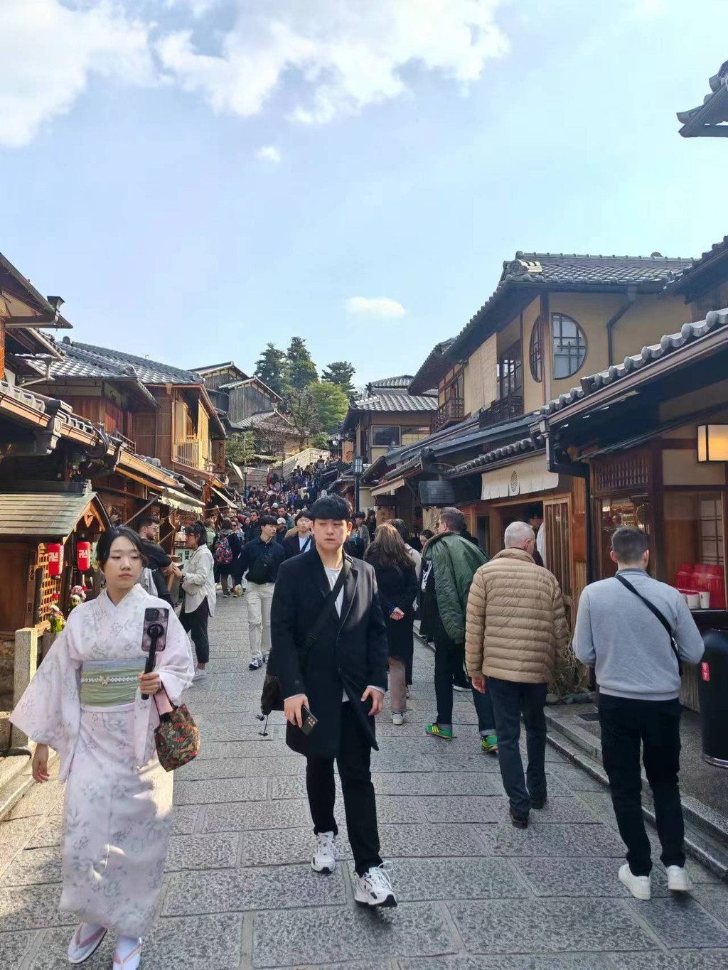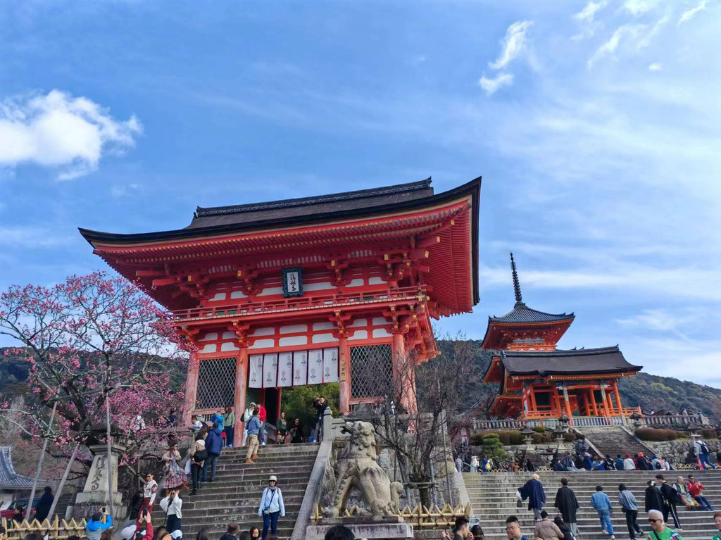 (6)3月14日:今天天气很好,要去逛室外景点和唐朝式商业街了。去了清水寺和周边街道,天气很好,慢慢逛,感受京都独有的特色街道。下午走累了,又找了个温泉梅汤去泡了,这其实是个澡堂子,不过还是很有特色的,有桑拿房、碳酸池,还有个电击池,在电击池里面被电的很爽。晚上回超市买好食物,在宾馆房间里吃了个呷哺呷哺火锅,主打和牛自由;