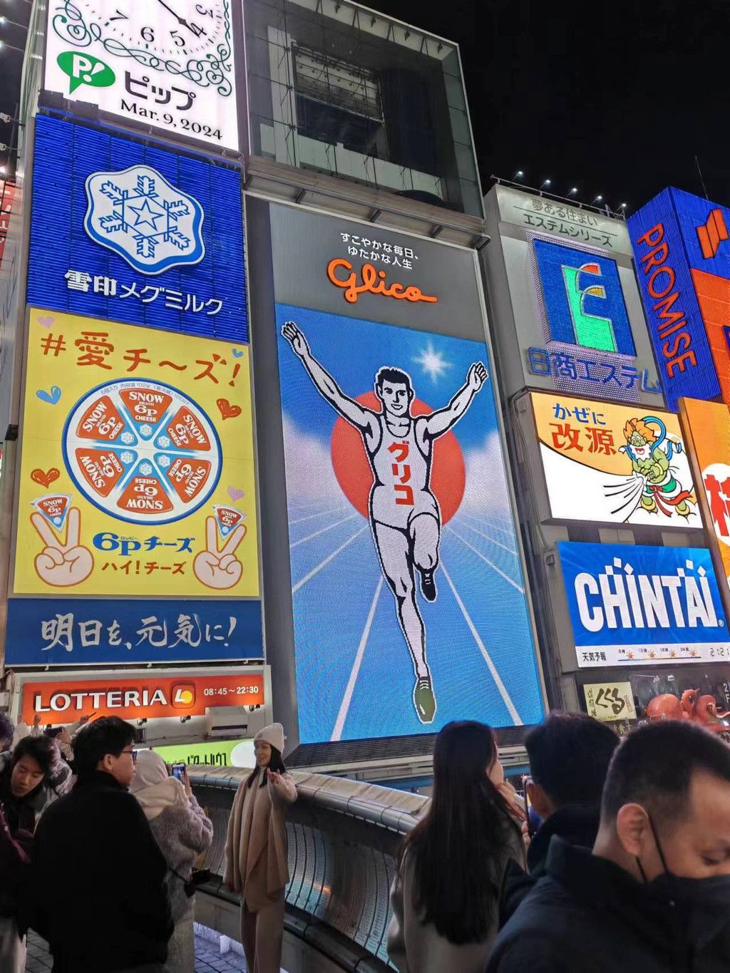 (1)3月9日:上海-大阪;下午到了关西机场2号航站楼,先做接驳BUS,到了1号航站楼,再坐南海线地铁,再换地铁,奔向心斋桥宾馆。办理入住后,周围找了家烤肉店吃晚饭,吃饭时,发现旁边有个AEON超市,吃好饭就去买食物,住的宾馆都没有预定早餐,因为日本宾馆的早餐实在是太简单了,面包、咖啡、牛奶、色拉是标配,其他再有其他的也不多,还是食品超市更丰富,便利店其实也可以,会贵一些,如果住在公寓里,还可以自己加热,吃起来更方便,不过我们有办法,在宾馆也可以方便加热食物。日本大型连锁食品超市有很多,我们去过好几家。一般晚上7点以后开始打折,如果是第二天早餐,这时候买更划算,不过有些食物会卖完。比较推荐的有烤红薯、饭团、寿司、牛奶、果汁、薯片、小蛋糕、冰淇淋等,根据各人口味选择吧。反正各种鱼类,日本都是在正常食用。晚上在心斋桥附近看到了格力高小人,同时感受到那种繁华和活力,大阪现在已经变成一个世界人民的大阪,再次焕发出活力,确实有它独有的魅力。我们要加油了,疫情这几年我们停滞了!