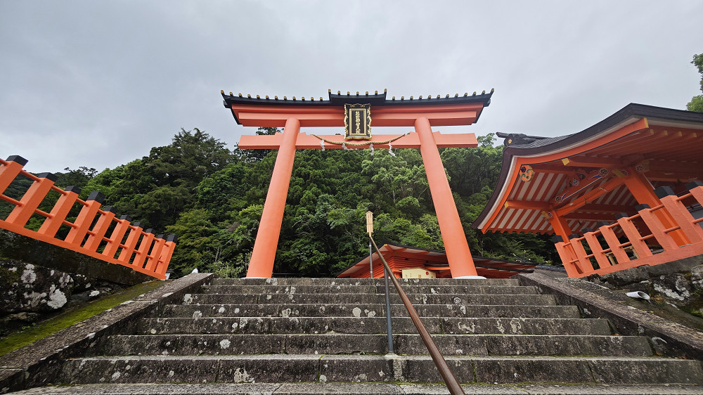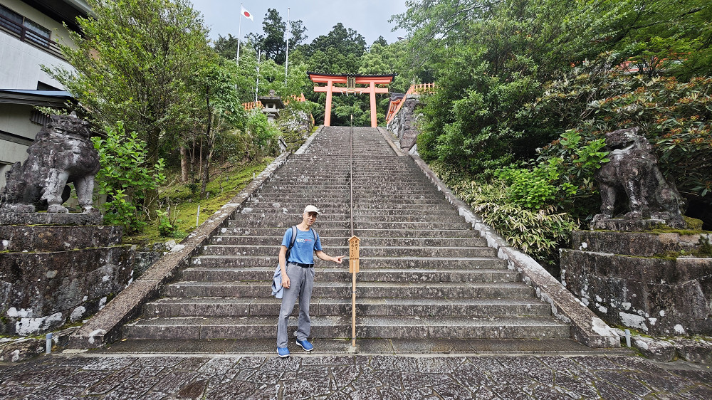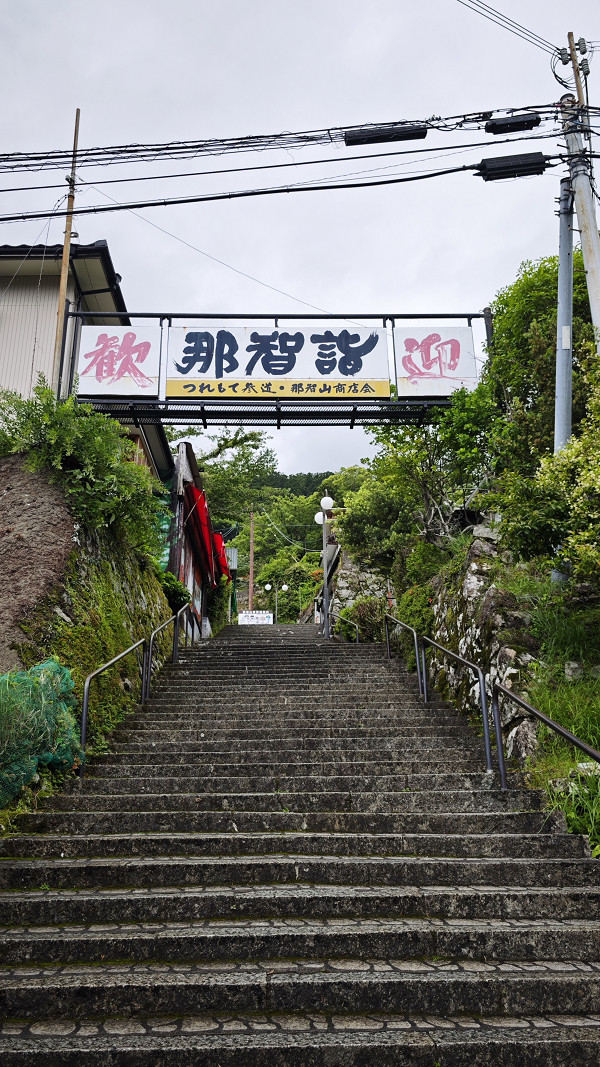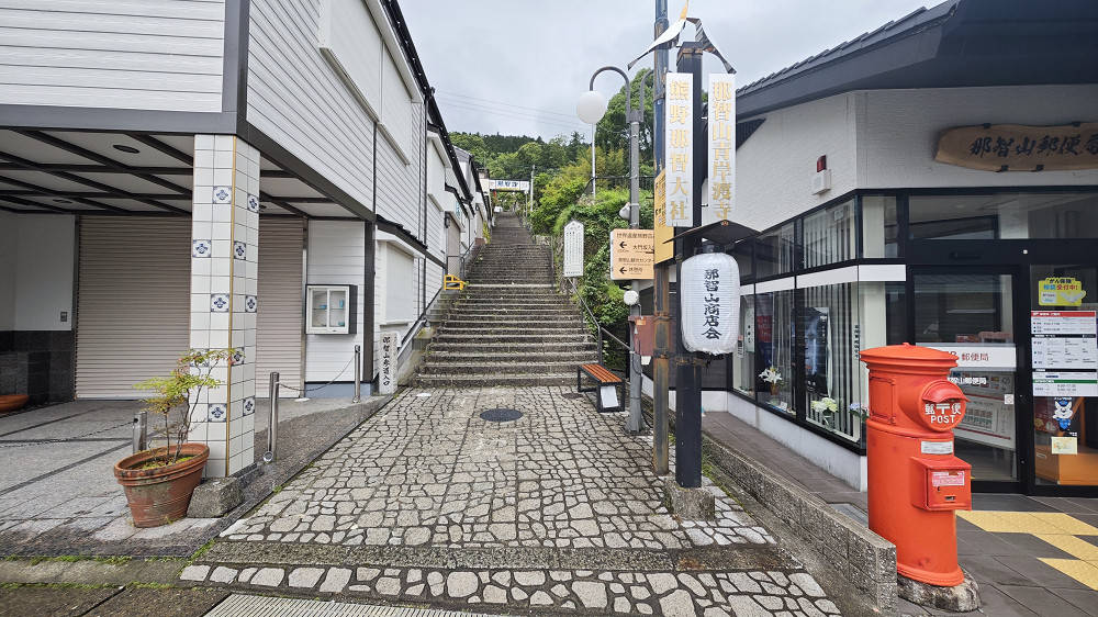 那智大社的入口,台阶尽头就是亮丽橘红衬着白底的熊野那智大社。