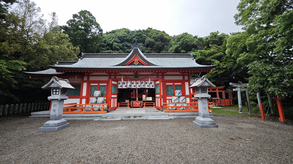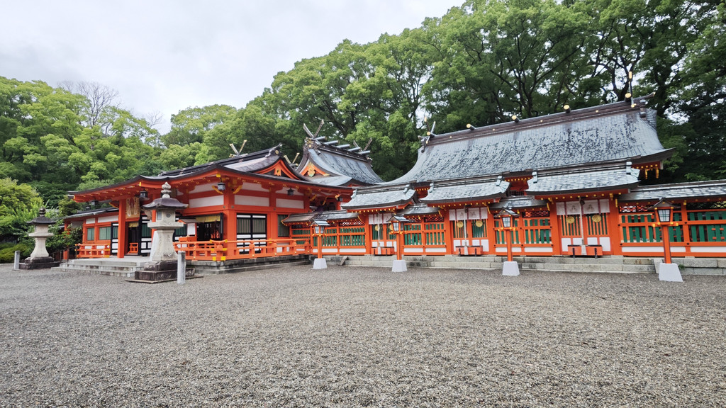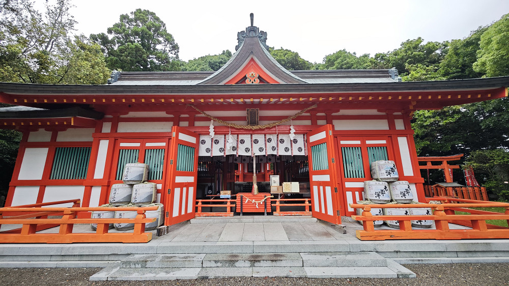 主殿采用朱红色木构建筑群,参拜道尽头的十二神大殿与千年竹柏神木形成独特的宗教景观。
