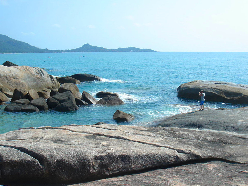 第一站,我们被带到了一个海滩。我们的司机只会对我们说看“爸爸、妈妈。”后来听别的导游说这是阿公阿妈石 (The Grandfather and Grandmother Rocks) 又称男人石(Hin Ta)和女人石(Hin Yai),这是一对是由天然岩石形成的非常别致的石头,矗立于拉迈海滩旁的岸边。独特形状似两性的生殖器官,两石约相隔20公尺,阿公石昂首挺立在群石之间,阿妈石则显得巨大而平缓,中间有道狭长且深的石缝。平时隐没在波涛汹涌的海中,只有在落潮时才可清楚看见。凡是来这里游览的游客无不惊叹它们鬼斧天工的逼真造型,继而又会忍俊不禁。