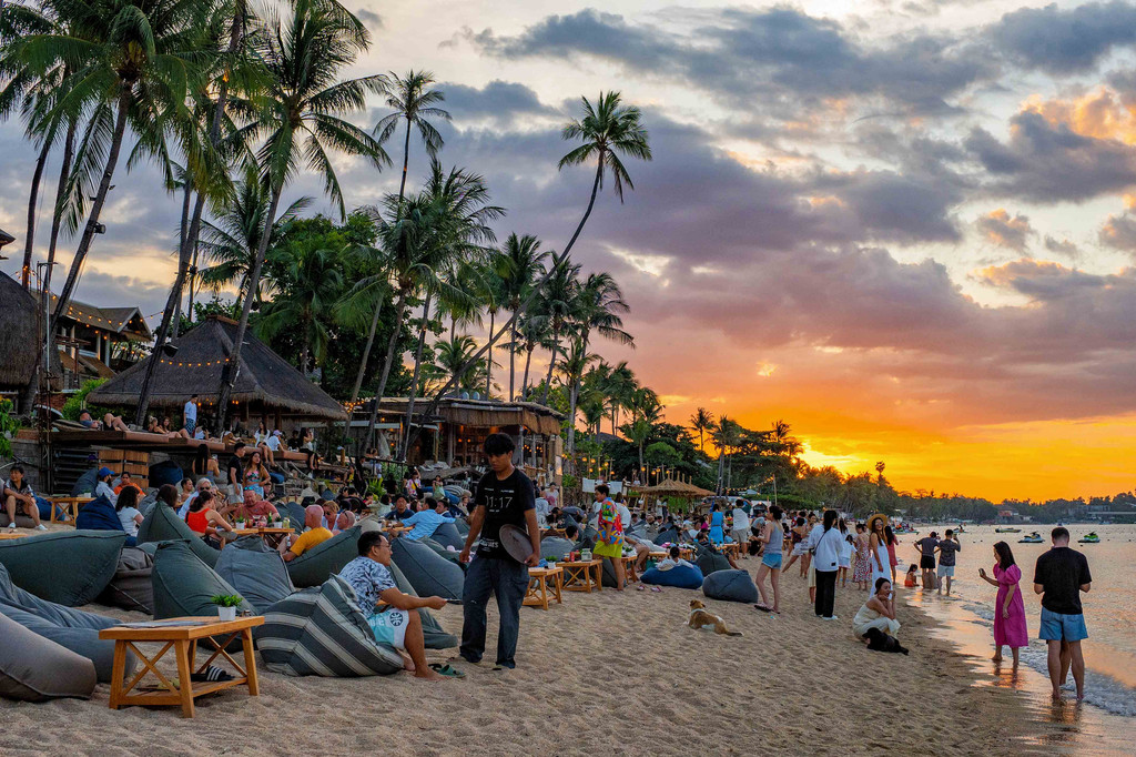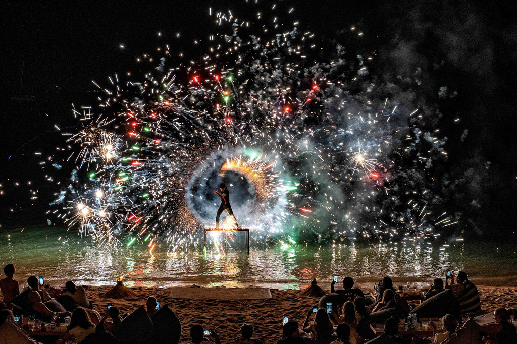 临海的餐吧,坐享无敌海景,海滩设有懒人沙发,餐厅内还有秋千座椅、小屋、水烟,及大型投影屏幕,天气晴好时候,可以欣赏迷人的日落美景,每天晚上还有精彩刺激的抛火球和打铁花表演。
