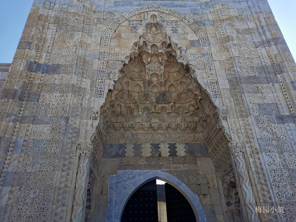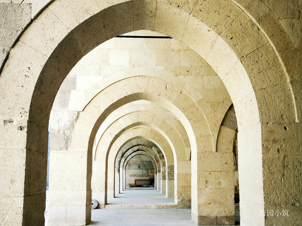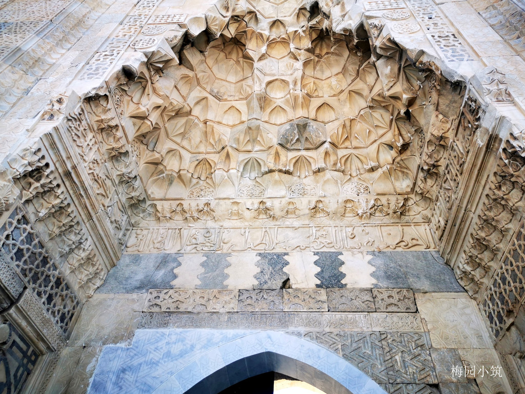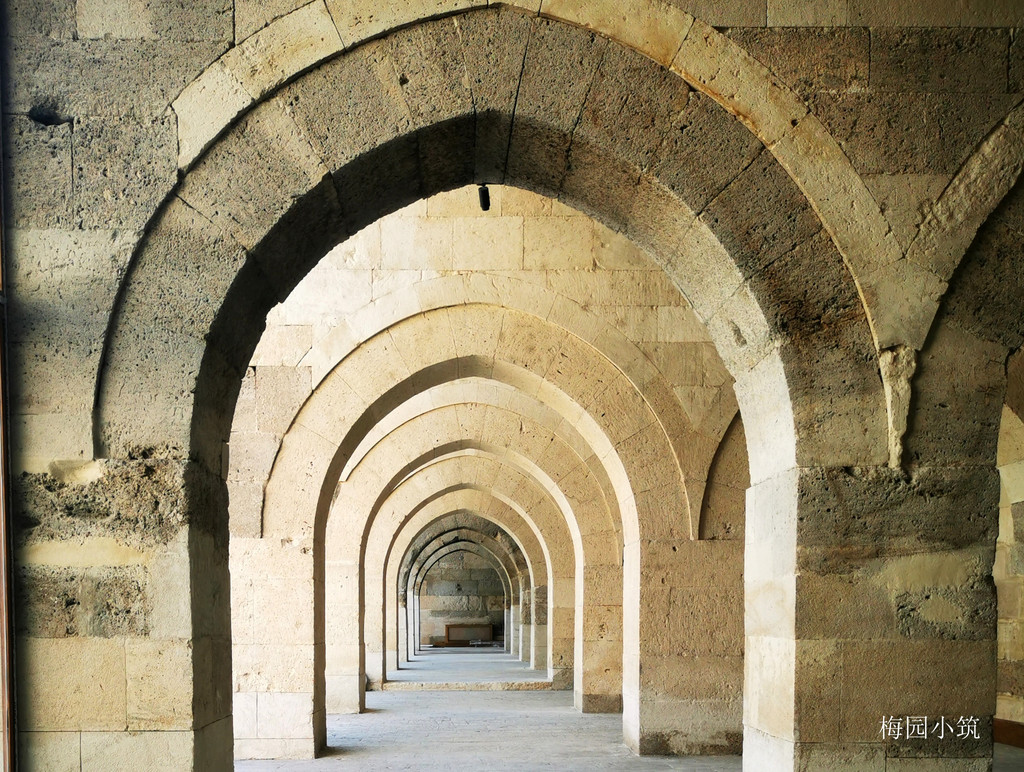 高大厚实的白色城墙用巨大的石块砌成,城门口内外侧都雕刻着极其精美的花纹图案。驿站的大门是典型的赛尔柱风格,有着繁复的精美雕刻,两位赛尔柱苏丹的名字,镌刻于大门两侧。驿站的一侧建成一面开放式的走廊,结构上依然采用圆拱形成宽敞的空间,客商们夏季的工作场地和马厩,做饭、喂牲口、整理行装都在这里。