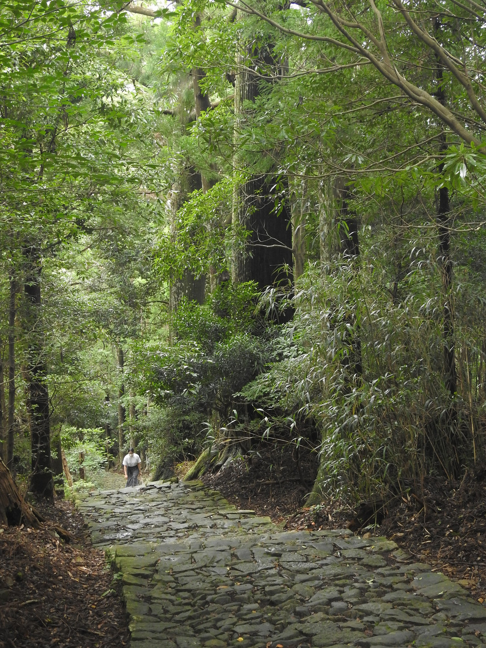 熊野本宫大社到熊野那智大社约50千米,花时1小时。对于我们不去参拜的外国人来说,从观光的角度,我认为三山中那智大社最值得去。倒不是因为那智大社本身有什么看头,那智大社附近有那智大瀑布,这是那智川从断崖落下形成的瀑布,落差133米,是日本三大名瀑之一;世界遗产的熊野古道(各地来熊野三山参拜者走的山间小路)中的大门坂就在附近,参天大树的中间夹着石板台阶路,非常有历史的印记。