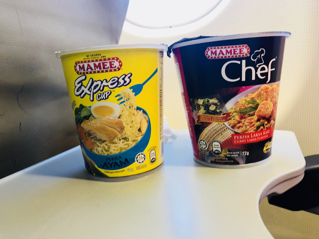 亚航是没有免费餐食的,但有出售各种东南亚口味的盖饭,比如各种咖喱鸡肉、牛肉饭等......,这种在上海都能吃到。当看到有速食面,我们不约而同地都想尝试一下。一份咖喱的、一份laksa的,味道绝对有够惊艳,尤其是laksa的那杯,超级浓郁的汤底。以至于后来回上海从网上淘了很多不定期解馋,哈哈。
