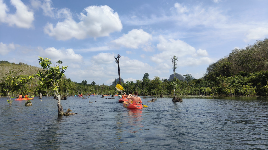 镜湖:离奥南海滩约11公里,不推荐打车(返程基本打不到车,或者会加价),租摩托车是最佳选择,一天200到300泰铢。镜湖一艘皮划艇200~300泰铢,店家提供救生衣。店家会给一个大的防水袋,可以把多余的物品存店里。两个人一艘皮划艇,我们一开始没请教练,但那天风大且是逆风,又是第一次划皮划艇,根本不向前走,并且水下木桩(树根)太多,一不小心就会搁浅。好不容易划回出发点,找了一个教练才顺利完成后面的行程。皮划艇加教练可坐三人,请教练200泰铢。必带物品:矿泉水、穿泳衣、物理防晒的衣物、手机防水袋、泳镜。镜湖风光确实还不错的,水也很干净,值得一去。可以下水游泳,但划到后程那个允许游泳的地方就算了,地方小感觉也不干净。出发点那里水面开阔,水也干净,有不少老外在那里游泳。