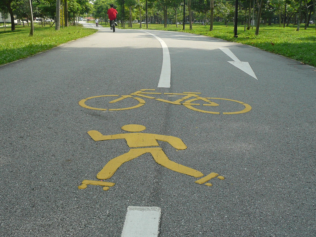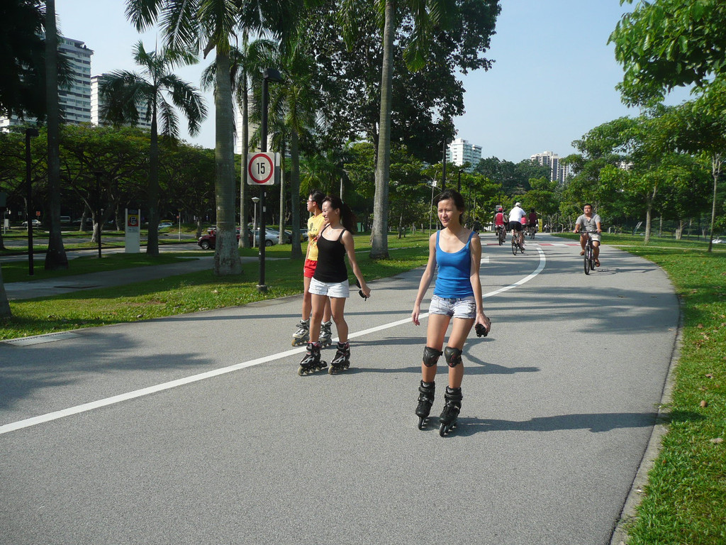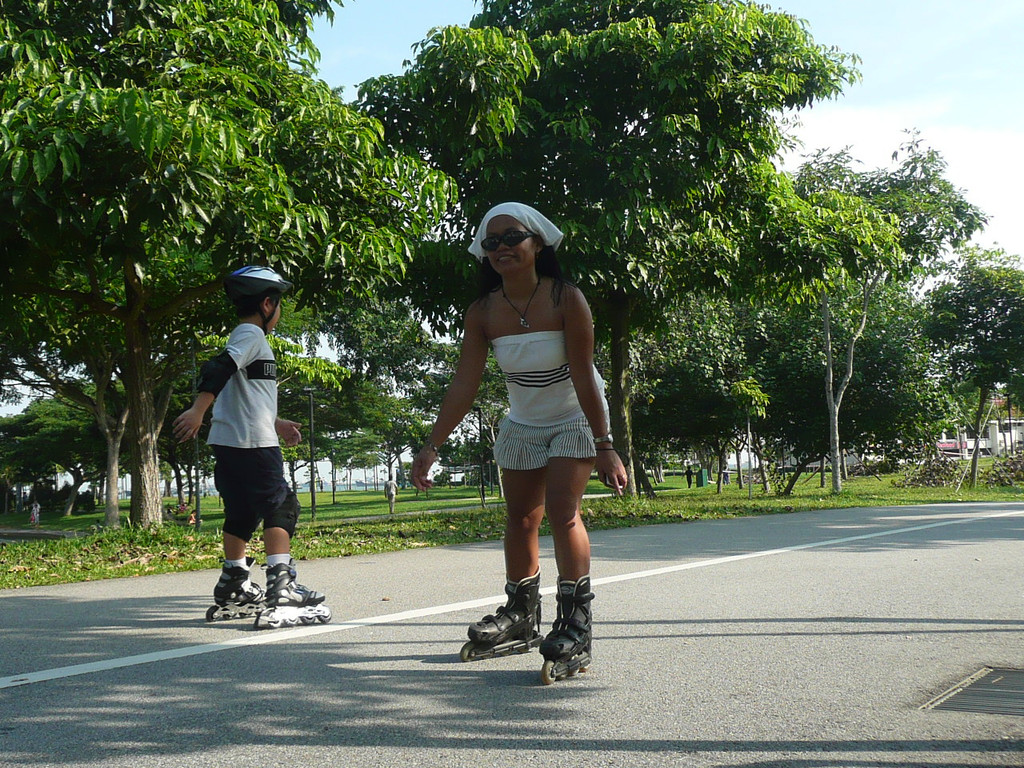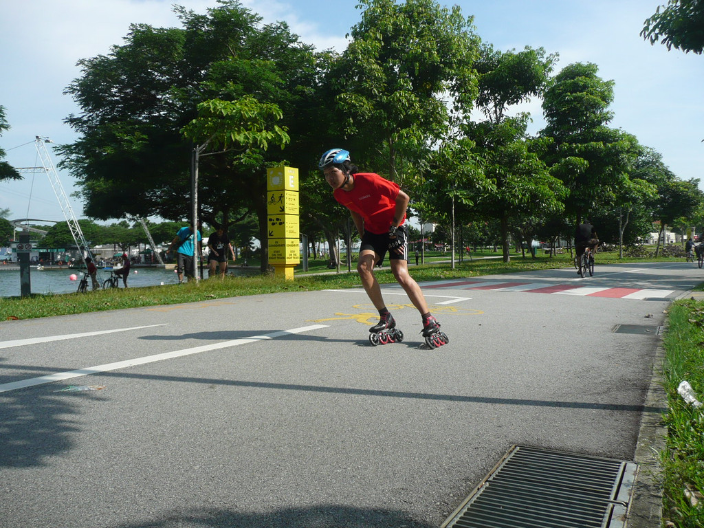 上午先去总统府,然后去市政厅、鱼尾狮看了看,主要项目是东岸公园。到东海岸公园,在地铁勿洛(Bedok)站(EW5)下,换401路公交(只是周末、节日有车)。这里环境非常美,一边是美丽的海滩,一边是椰林绿地,有专用的自行车轮滑道,还有专用的步行道。很多人在这里跑步、骑车、轮滑。这里离樟宜机场很近,有机会可以专程来轮滑。