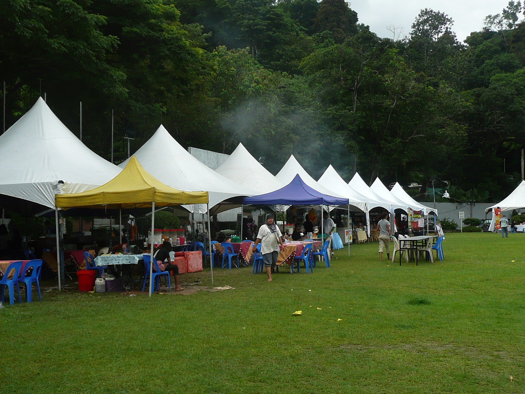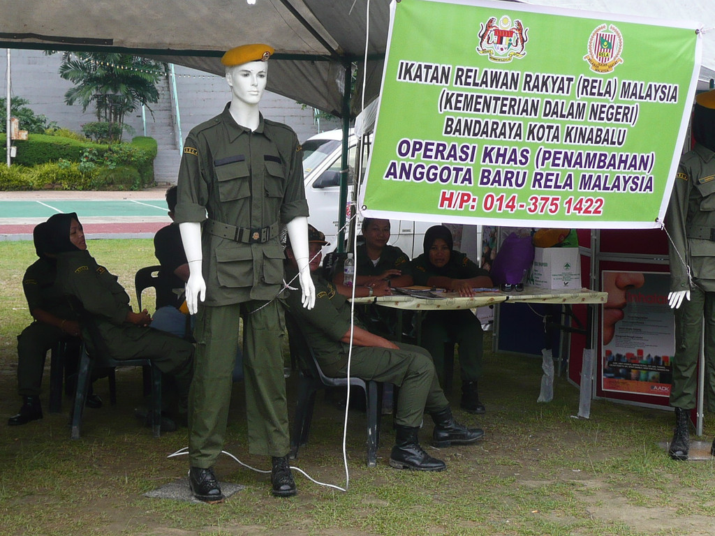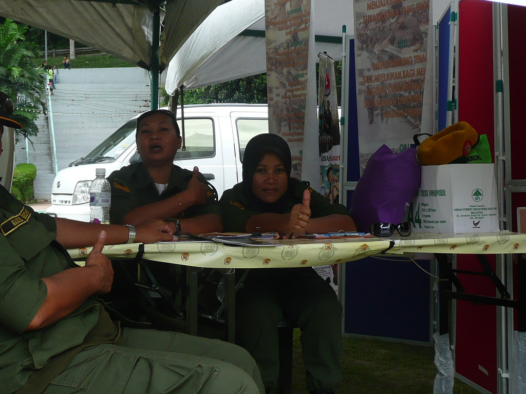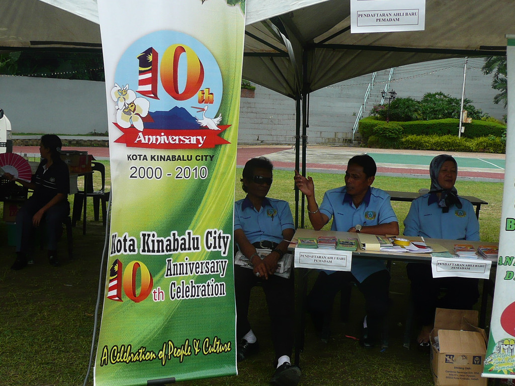 逛完周末市场,我们去了独立广场。广场正在举办纪念亚庇市成立10周年演出活动,城市的治安、消防、医疗、教育、市政等部门都在这里设立了摊点,提供咨询服务。