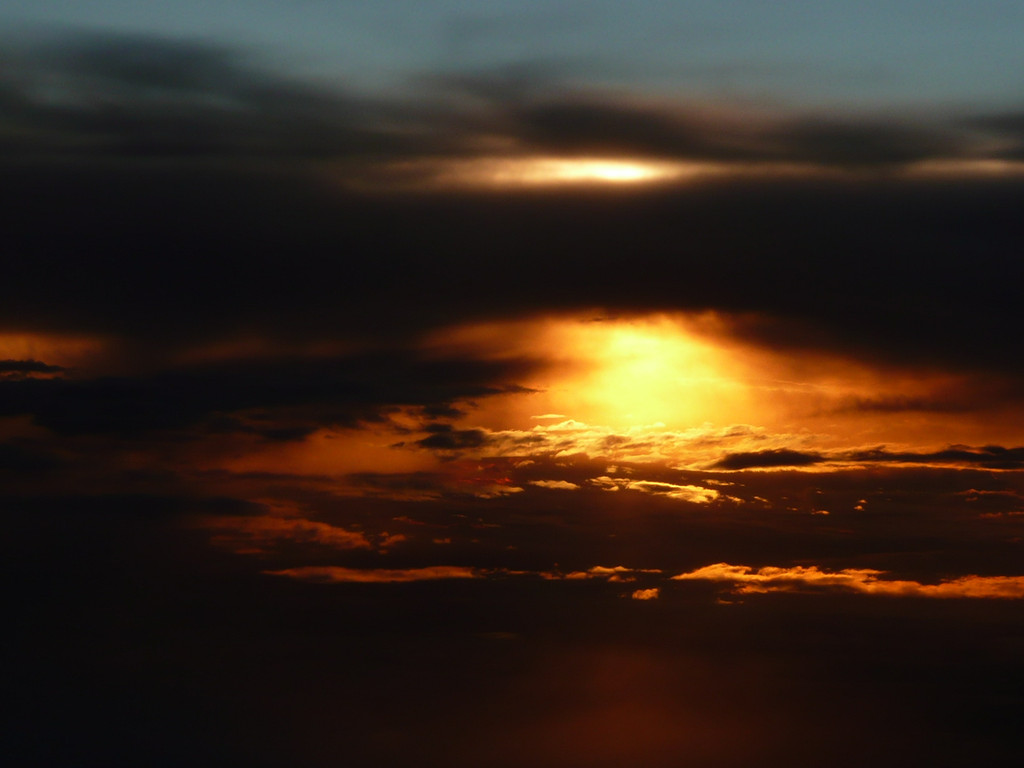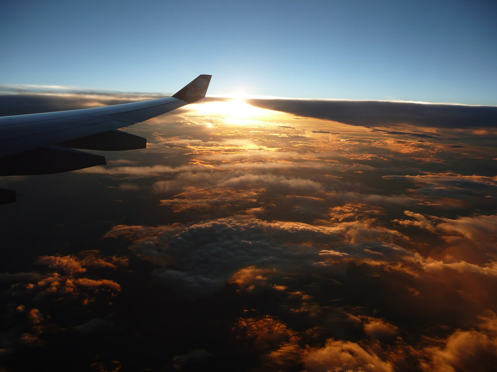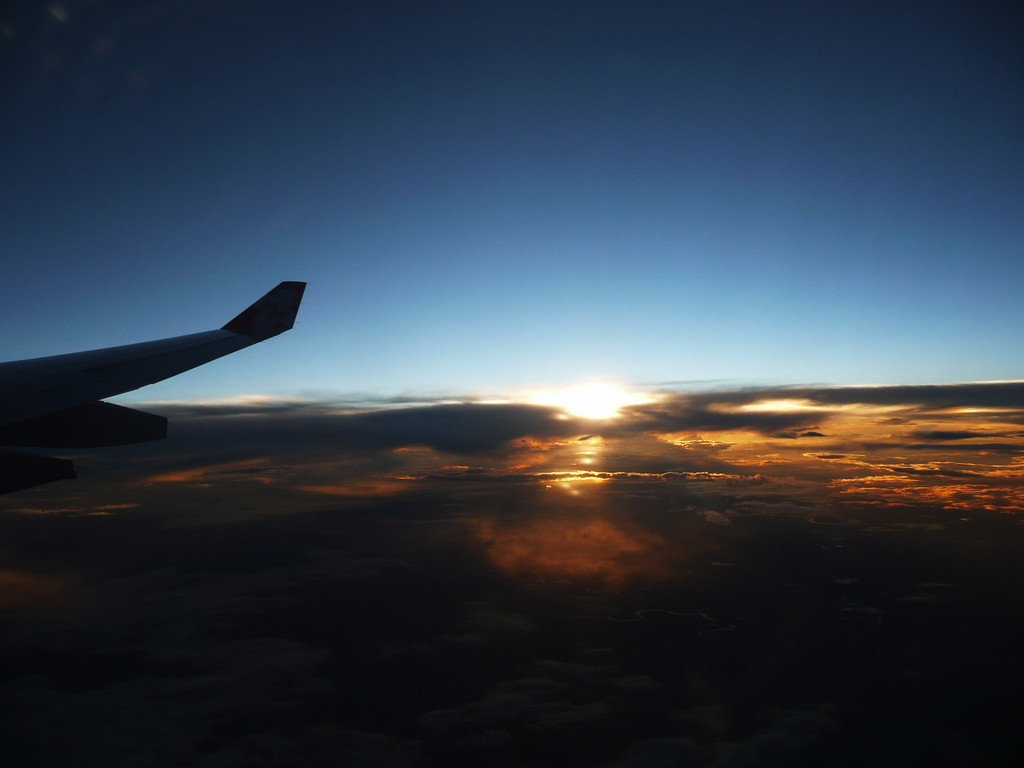 15:00准时登机,但是跟4月份那次一样,起飞晚了近一小时。上座率比四月高多了,机舱基本都坐满了,一人坐三个人座位的好时光不在。飞行途中在越南上空看到了壮丽的日落。