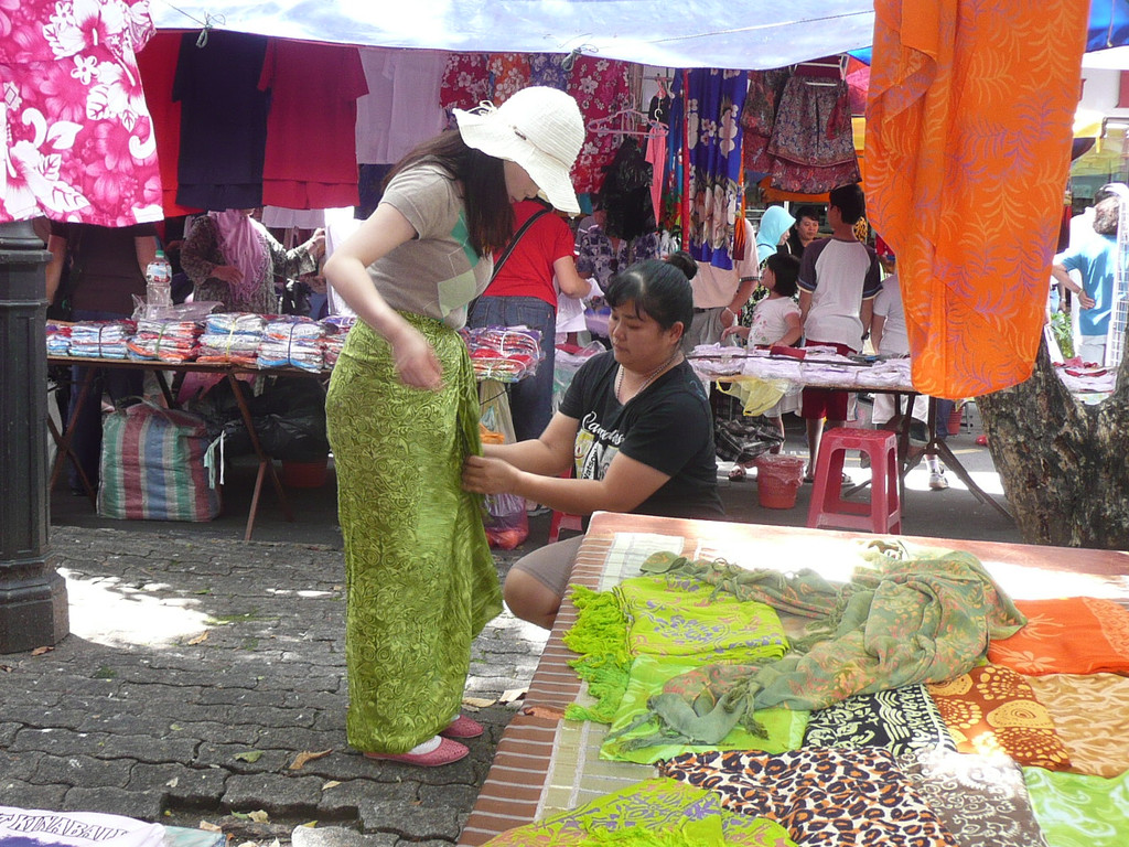 周日市场在Gaya 街,来自各地的游客和本地人好像都集中到了这里。摊档一个挨着一个,货品挂摆令人眼花缭乱,琳琅满目的手工艺品奇特又可爱,有手提袋、小钱袋、木制相框、民族小娃娃,还有风铃、手链、颈链、戒指、扣针等色彩缤纷的装饰品,以蜡绘图印记而成的衣裤,印有“沙巴”字样的形形色色T恤等。11马币买了两件T恤。