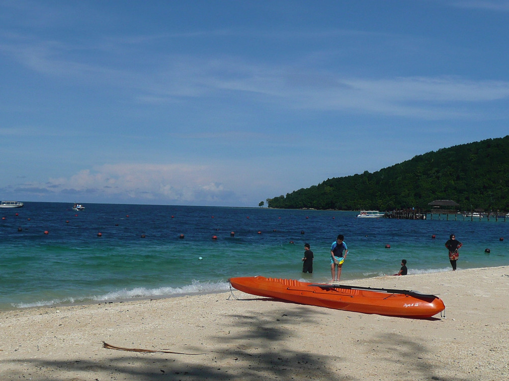 酒店的车先把我们三人送到城市西部的码头,这里是个私人游艇码头,港里停满漂亮的游艇。导游陪我们三人乘坐专艇前往曼奴干岛。东姑阿都拉曼国家公园由五座小岛组成,曼奴干岛最大。船十几分钟就到了岛上,东岸北部的海岸坡度比较深,海里有大片珊瑚,只需游出几米就是大面积的珊瑚区,可以看到成群的漂亮的热带鱼。驻足岸边海水清澈见底,五颜六色的珊瑚若隐若现,各种各样的热带鱼游来游去,许多未曾见过的鱼群与你擦身而过。海边还有很多座椅,供游人休息、野餐、看海。