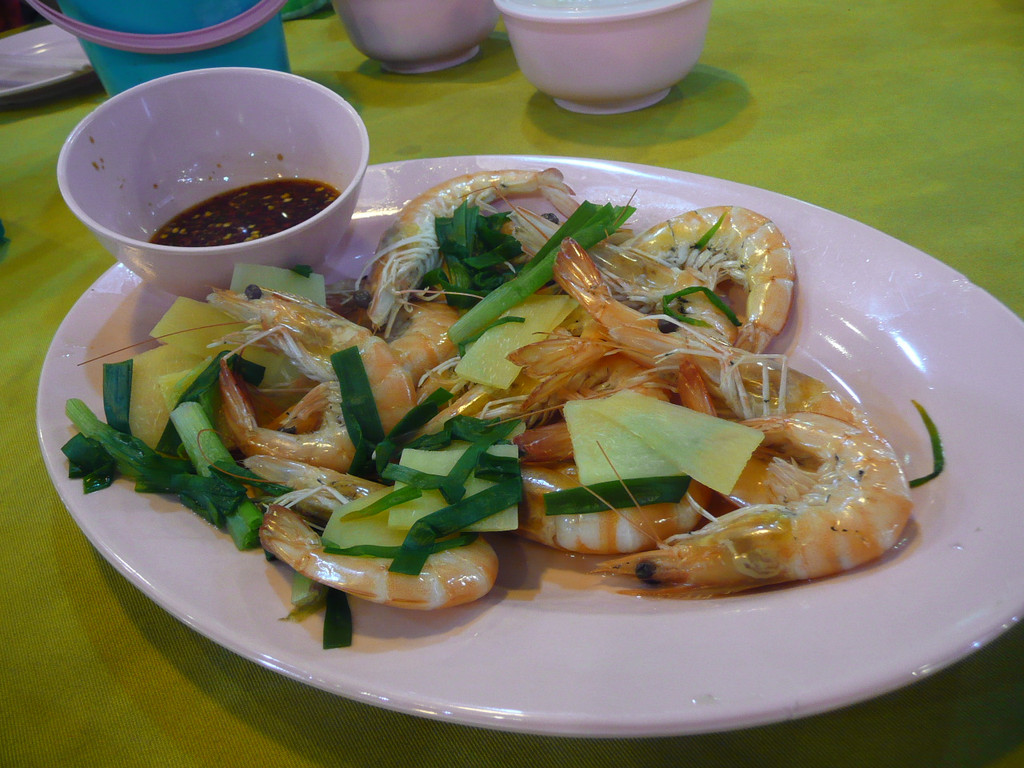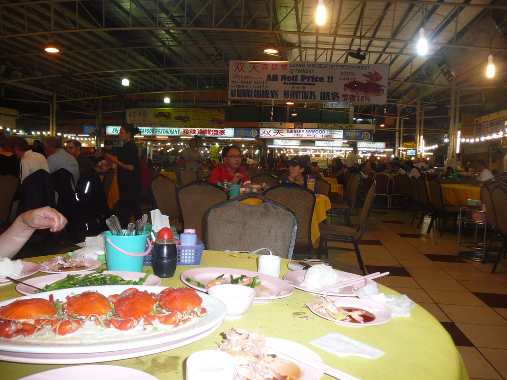 休息够了,晚上坐班车再次进城吃饭。著名的双天餐厅,四只大海蟹才12马币,而一盘炒蔬菜竟然15马币!虾也很新鲜便宜。