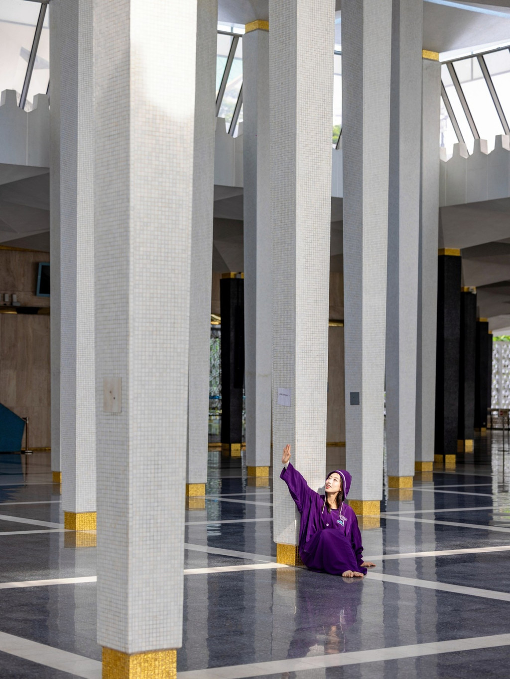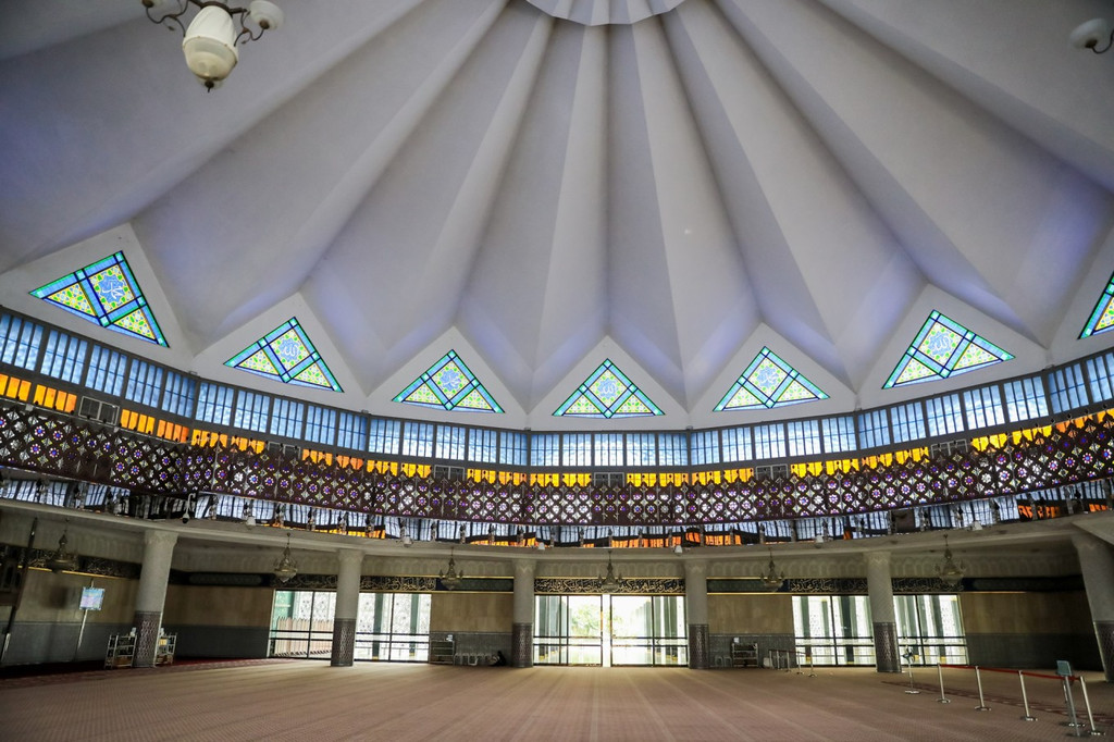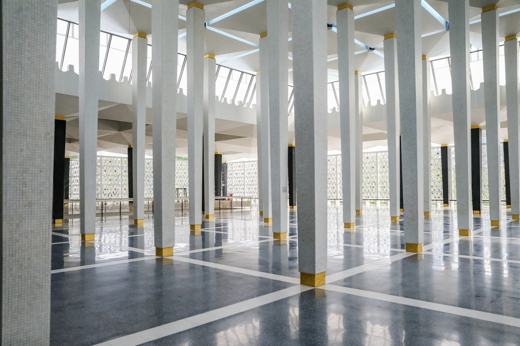 国家清真寺像一把打开的大伞,白色的伊斯兰建筑风,屋顶由49个大小不等的圆拱组成,呈18条放射星芒。在祈祷大厅的旁边就是大尖塔,塔尖的形状像火箭,高73米。寺内无空调,但走进去感觉神清气爽,赤脚踩着地面,进入祈祷大厅前要经过一个宽阔的厅堂。一位当地阿姨对我说,来这里要捧起双手向阿拉祈祷,给与自己和家人得到好的东西,虔诚期待好的事情发生。