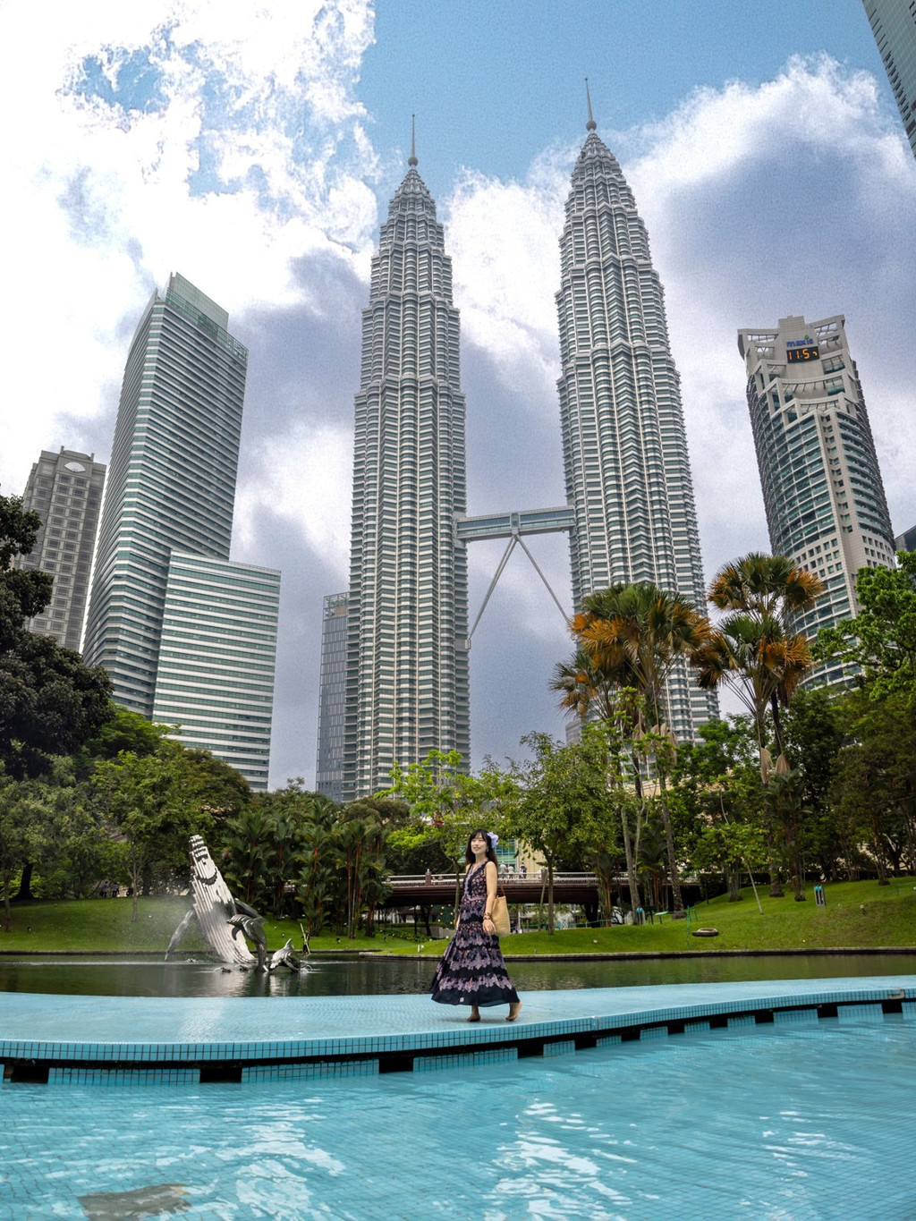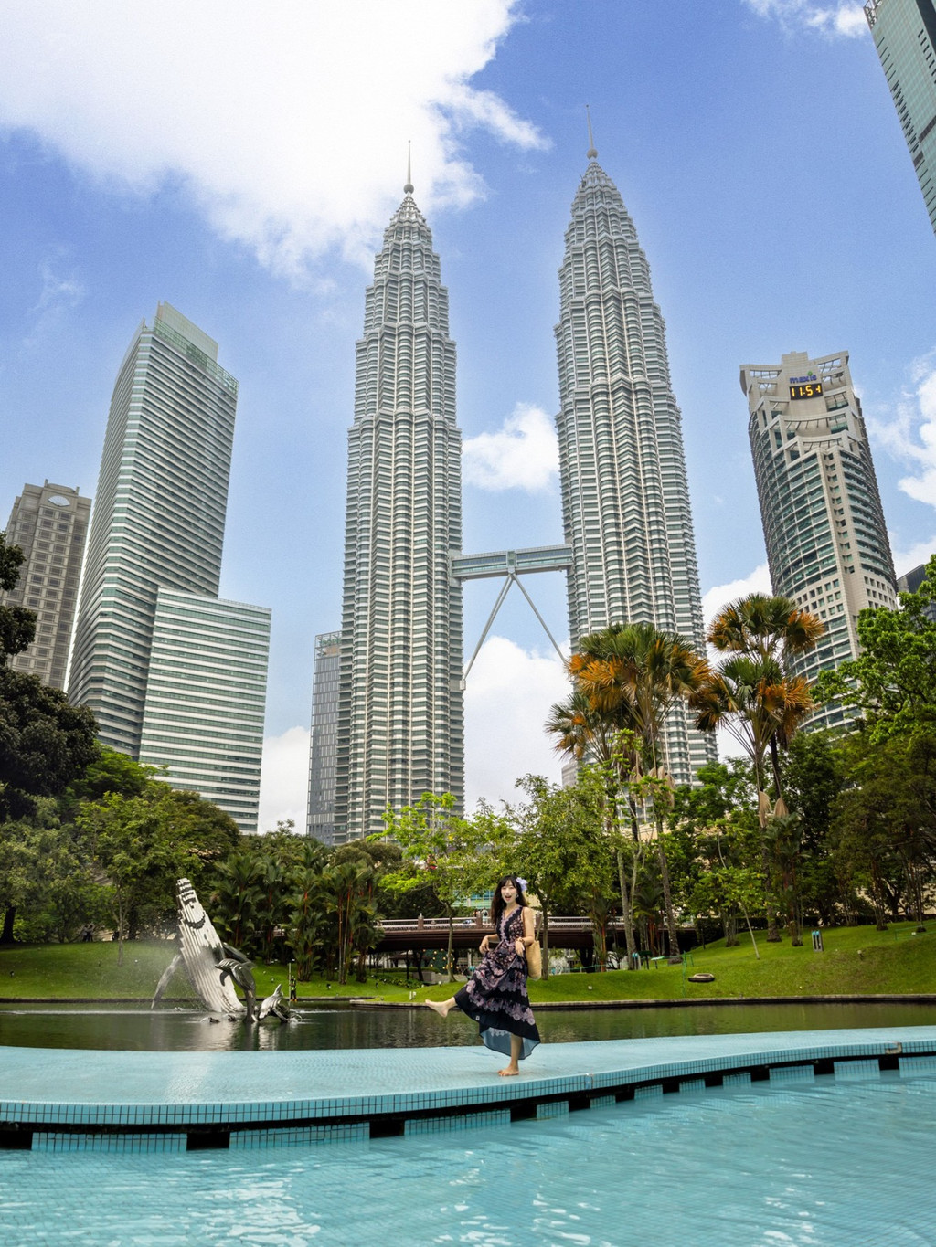 先到KLCC shopping mall(双子塔楼下的商场),找到通向city park喷泉广场的门。出去后你会发现很多人在门口聚集在喷泉广场拍照。可以先在这里打卡拍照,然后往喷泉方向走几分钟就能看到一只小海豚雕像。附近有一个小型儿童水上乐园,有很多小孩子在玩水。在这个平台上可以拍到双子塔的全景
