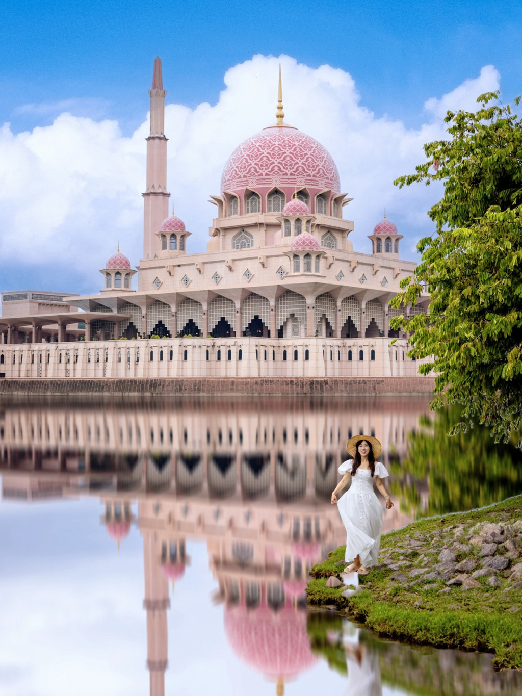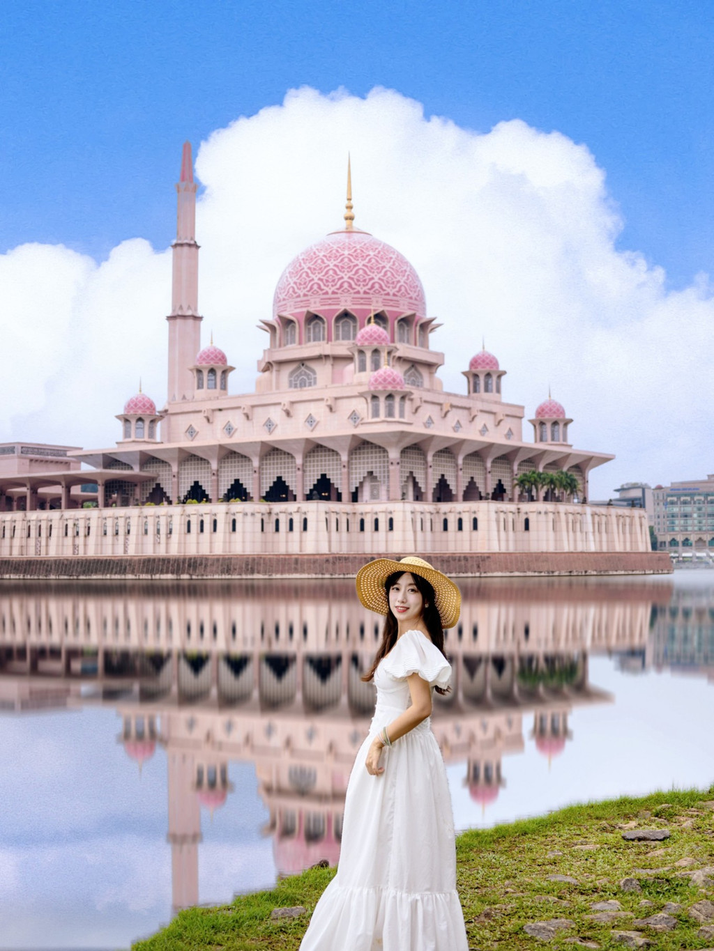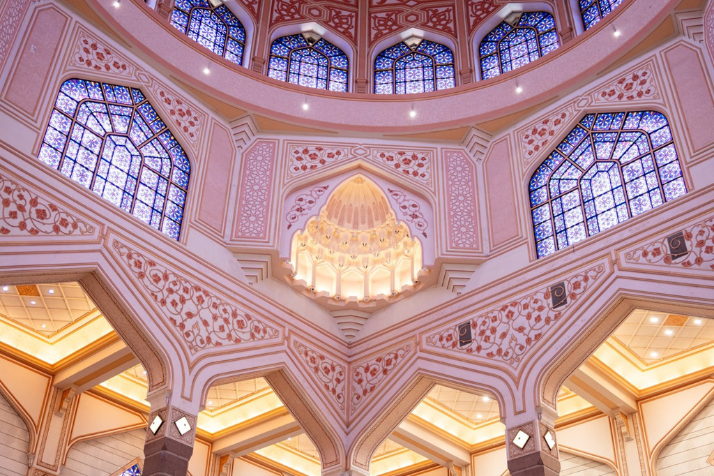 布城第一站打卡地标粉红清真寺,粉色的建筑物建在水面之上真的很美! 30℃的中午,和笑妍找齐粉红清真寺的五个机位,拍到满头大汗,粉色真的很浪漫很好拍!这座粉红色的清真寺是马来西亚布城的标志性建筑之一,因其顶部花岗石砌成的粉红色屋顶让人过目不忘,距离吉隆坡市区20公里,三十四分钟车程,其主体建筑有四分之三建在水上,可以容纳15000人一起祈祷。