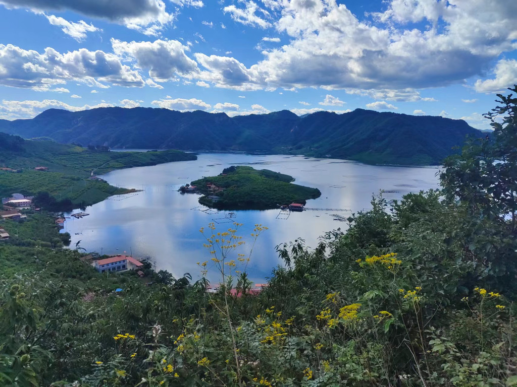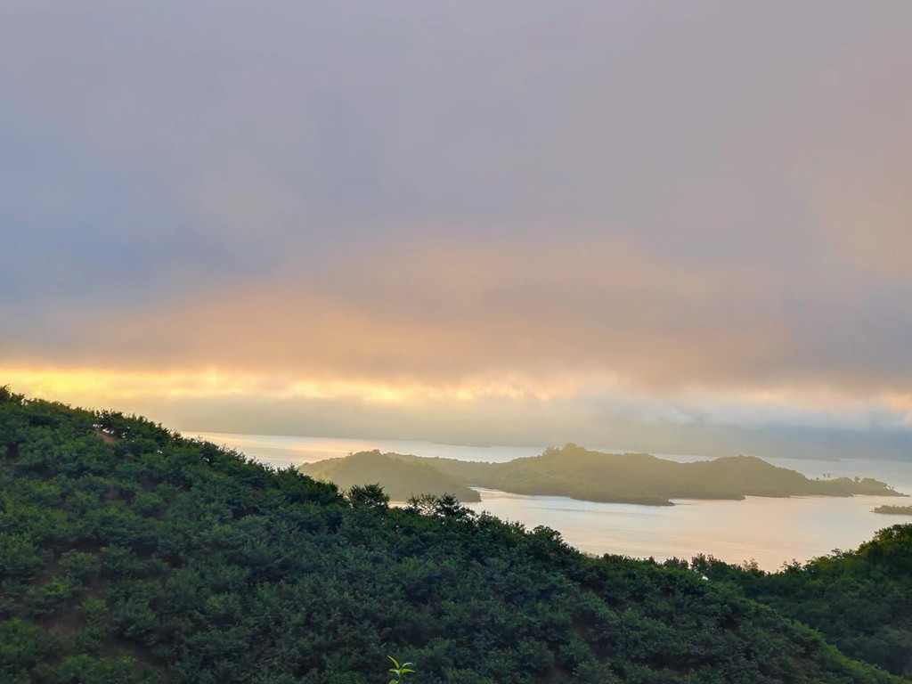 3.从民宿上后山,山上都是周围村民种的果树和板栗树。山路路况一般,建议去穿防滑的鞋。在后山上看风景,美的不要不要的。在这就能感受“东北小千岛湖”的风采。老板会推荐一条看朝鲜风景的路,会走一小段板油路,然后又是种满桃树的山路。不太好走,但是到达地点以后,风景会让你觉得不虚此行。虽说不是特别惊艳,但绝对不觉得不值。这里同时是看日出的好地点哦