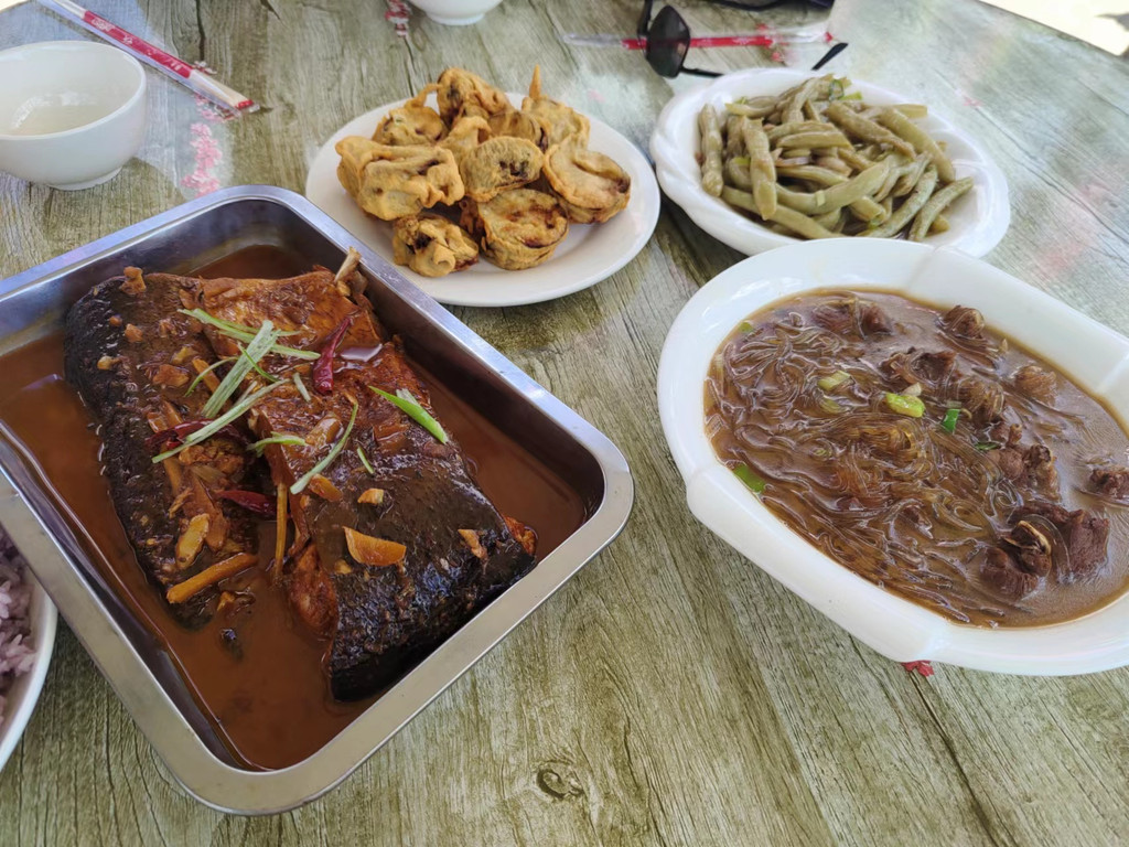 午餐:米饭,鸡肉炖粉条,炸茄盒,烧江鱼,大锅炖芸豆。