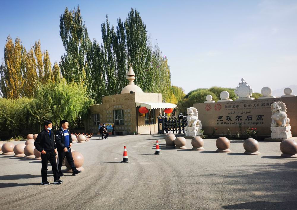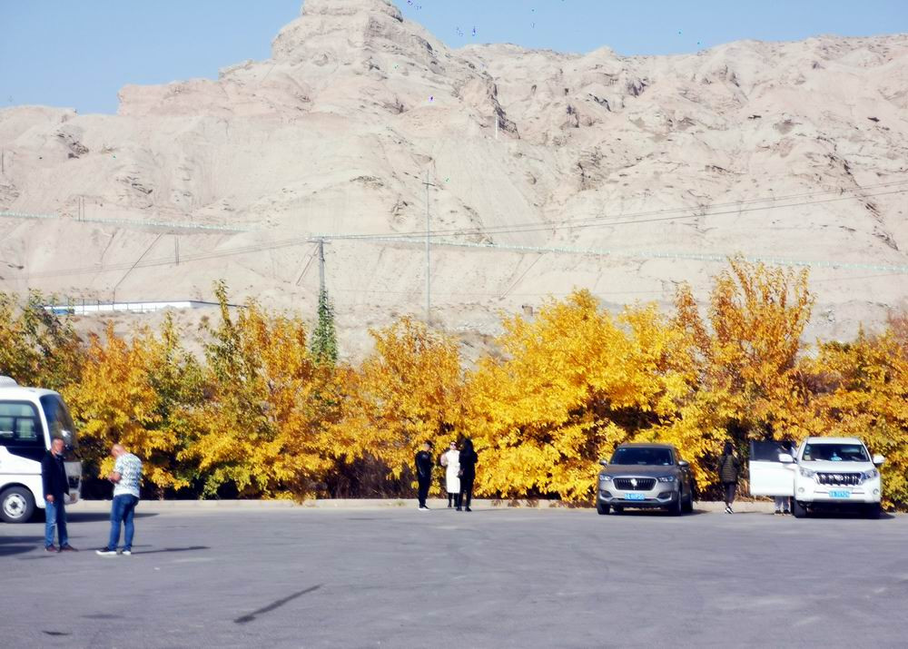 克孜尔石窟建在木扎特河边的一处山崖上,是中国开凿最早的石窟,比敦煌早半个世纪,而且延续开凿了几百年。图为克孜尔石窟的停车场。