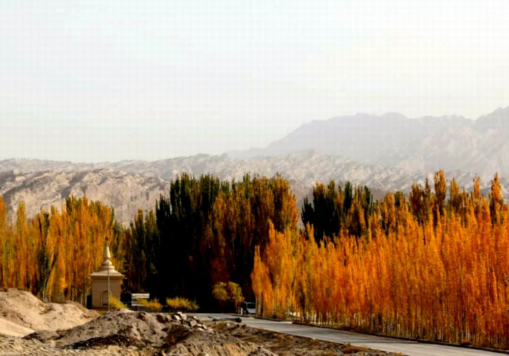 克孜尔石窟的悬崖下,金黄的是白杨,腾起白花的是小溪,刺破青天的是奇峰。山光、水色、杨树、石窟,交相辉映,各显绮丽,构成了一幅极美的画卷。