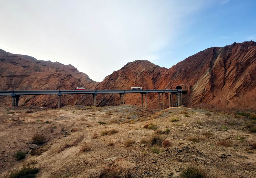 10月18日,早餐后乘车前往克孜尔石窟。巴音库车至布鲁克是独库公路的南段,导说说南段比北段风景更美。在独库公路上行驶了几十公里,路边地貌果然比较奇特,类似丹霞地貌,山体各种颜色交织,还有各种形状。这些景色在新疆看起来非常平常,但如果在内地就成了旅游热门。