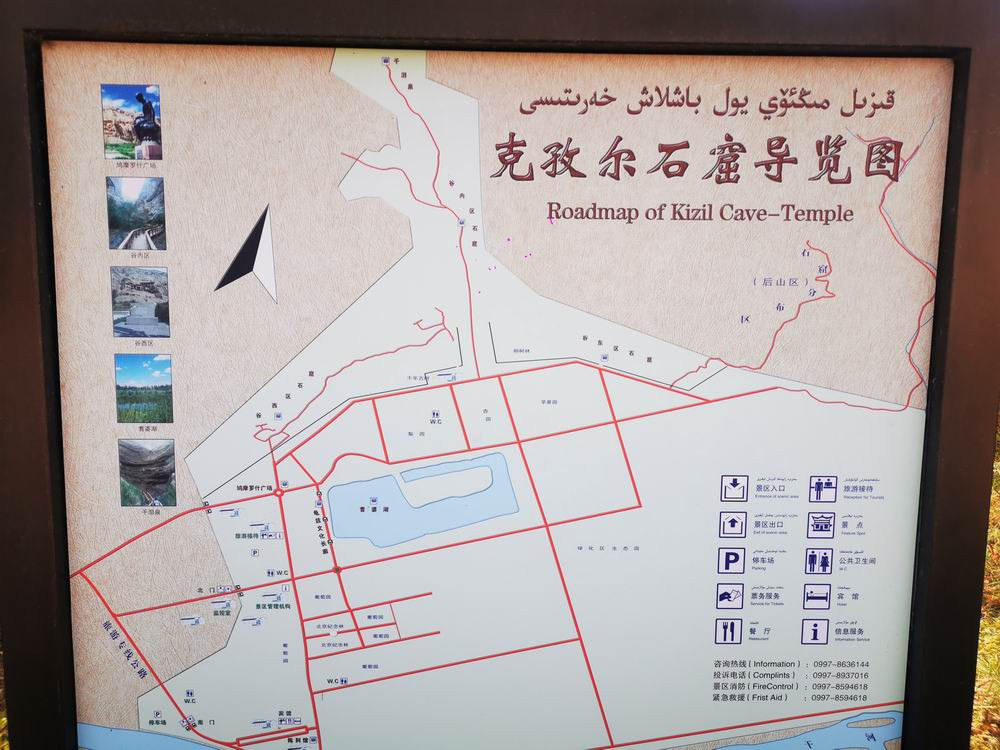 克孜尔石窟分4个石窟区,共有大小洞窟236个,大部分塑像已被毁,其中保存较完整的有135个,内有壁画的80个,是中国开凿最早、规模最大的石窟群。图为克孜尔石窟的导览图。