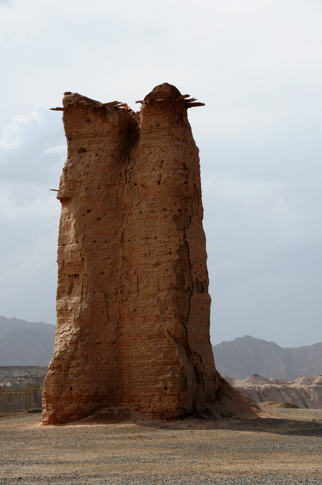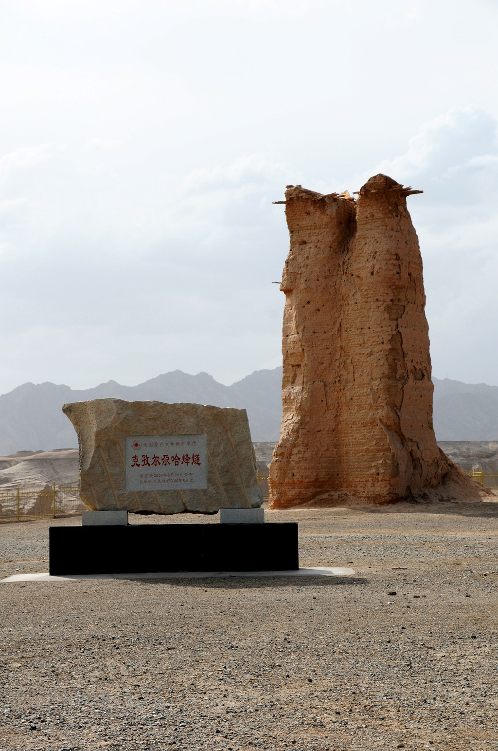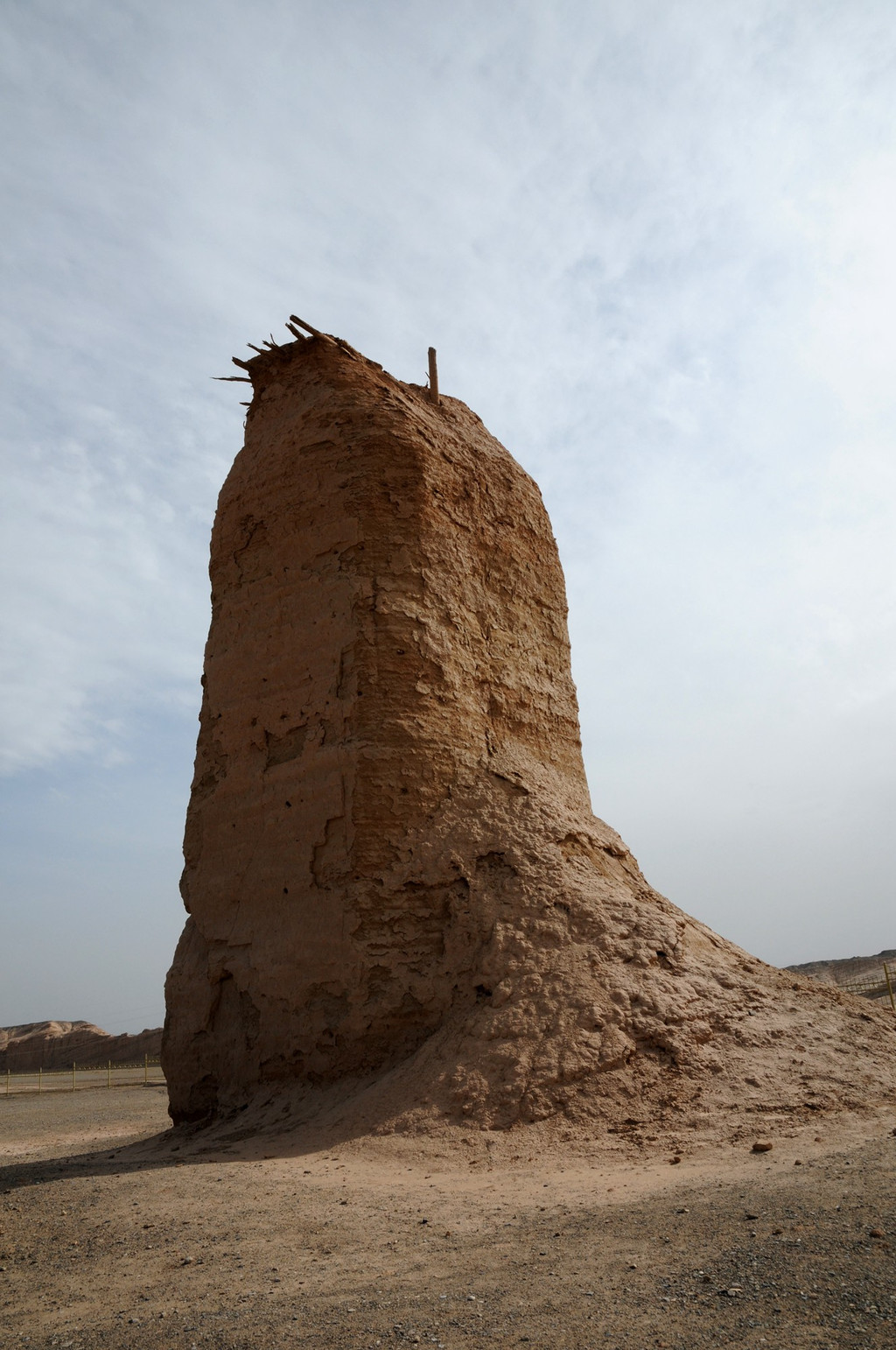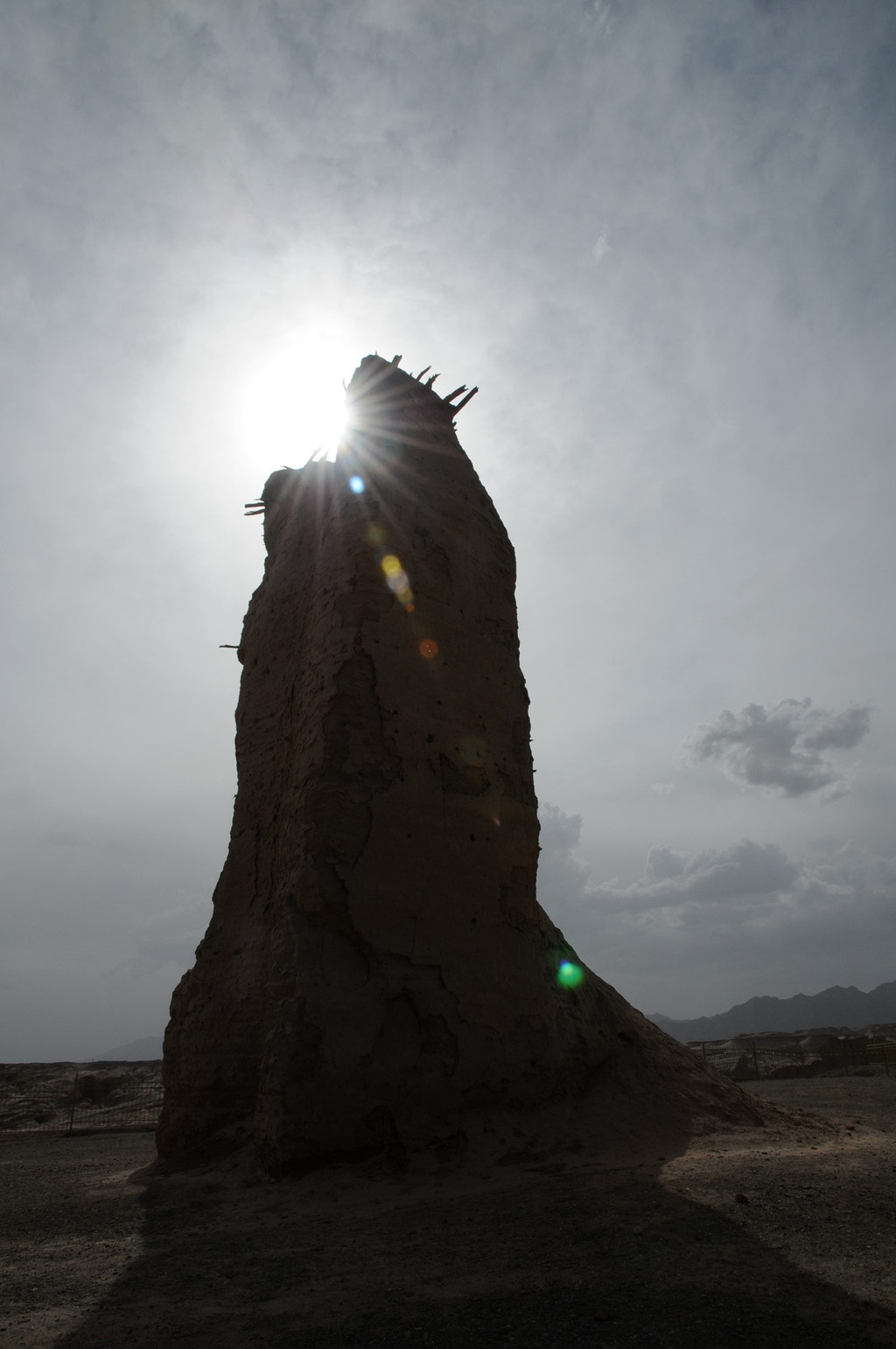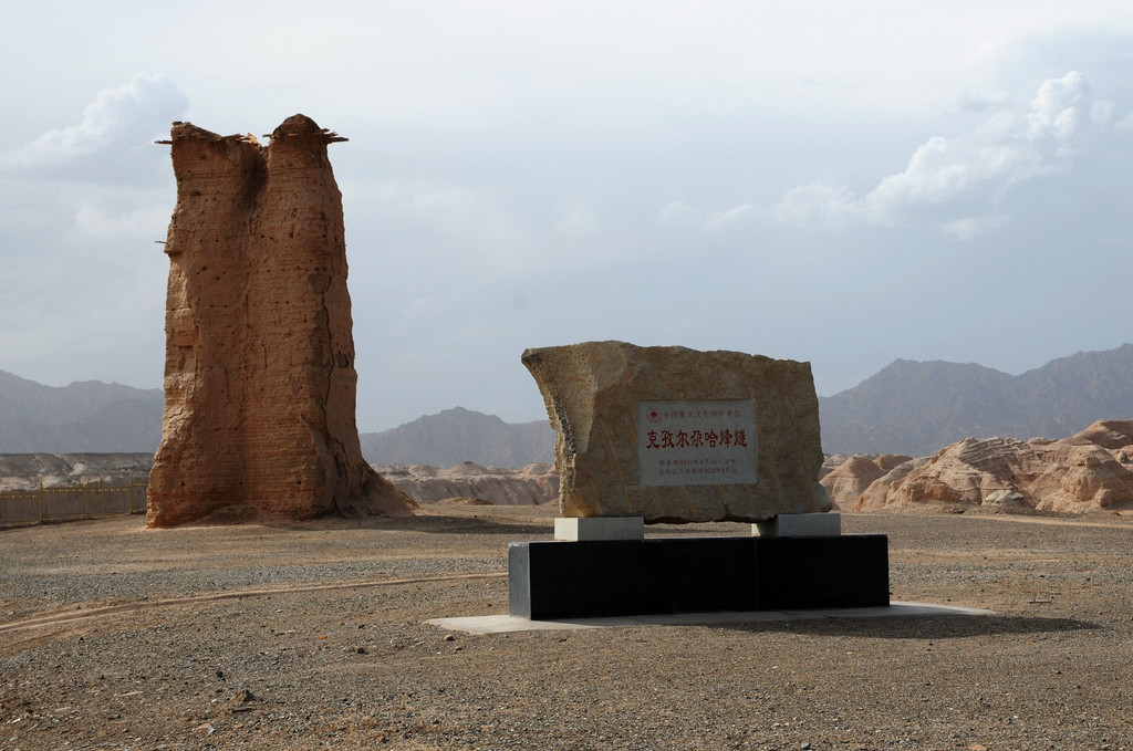 克孜尔尕哈烽燧离库车县城不远,在城北12公里处的库车河边,烽燧背倚却勒塔格山,面朝库车绿洲,深居盐水沟谷,烽燧的四周是一片比较平坦的黄土地,四、五层楼高的烽燧便显得特别突出。烽燧的烟火已经熄灭了千年,用天空中的云作为背景,遥想一下当年的烽烟。