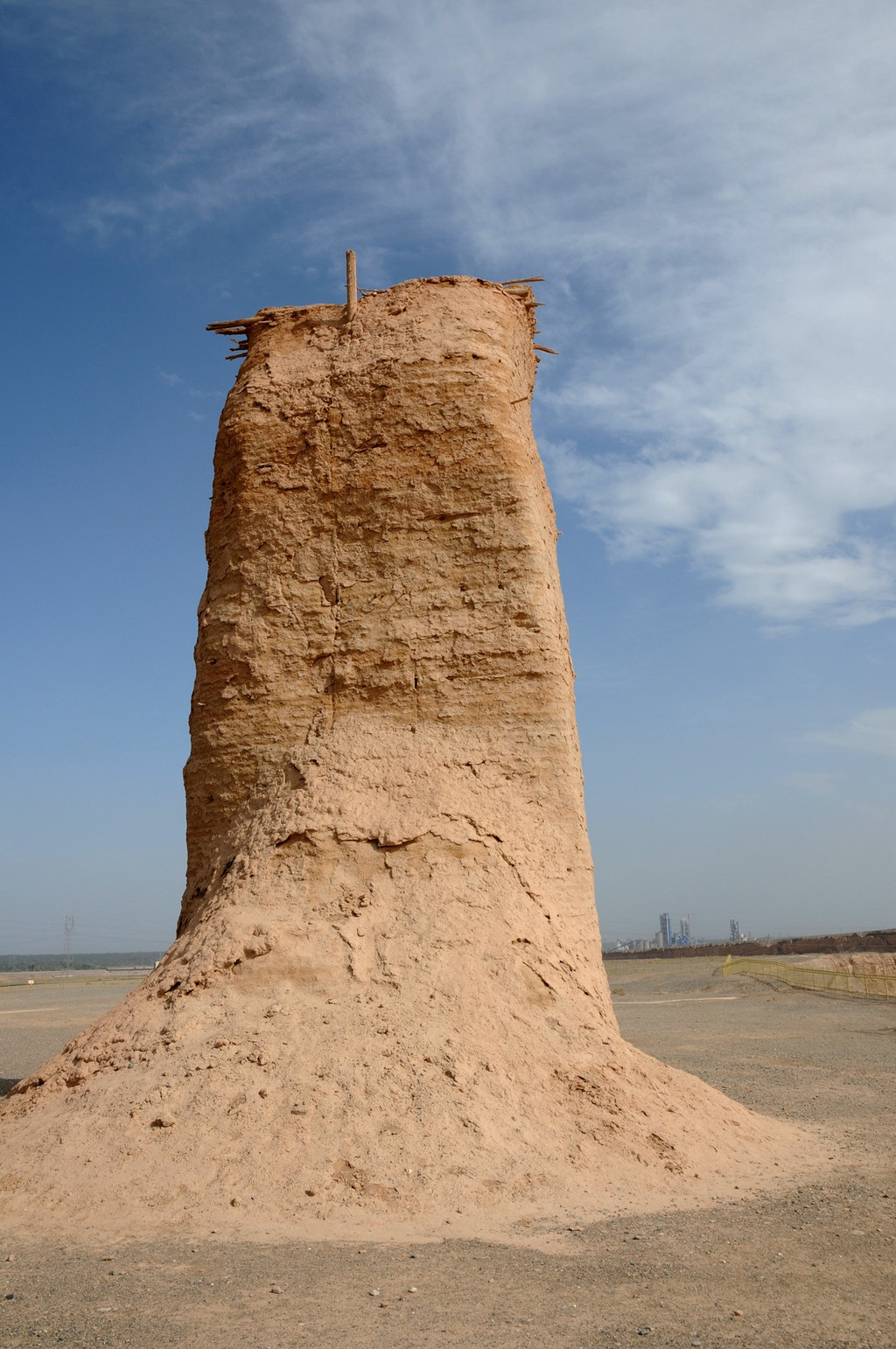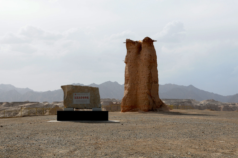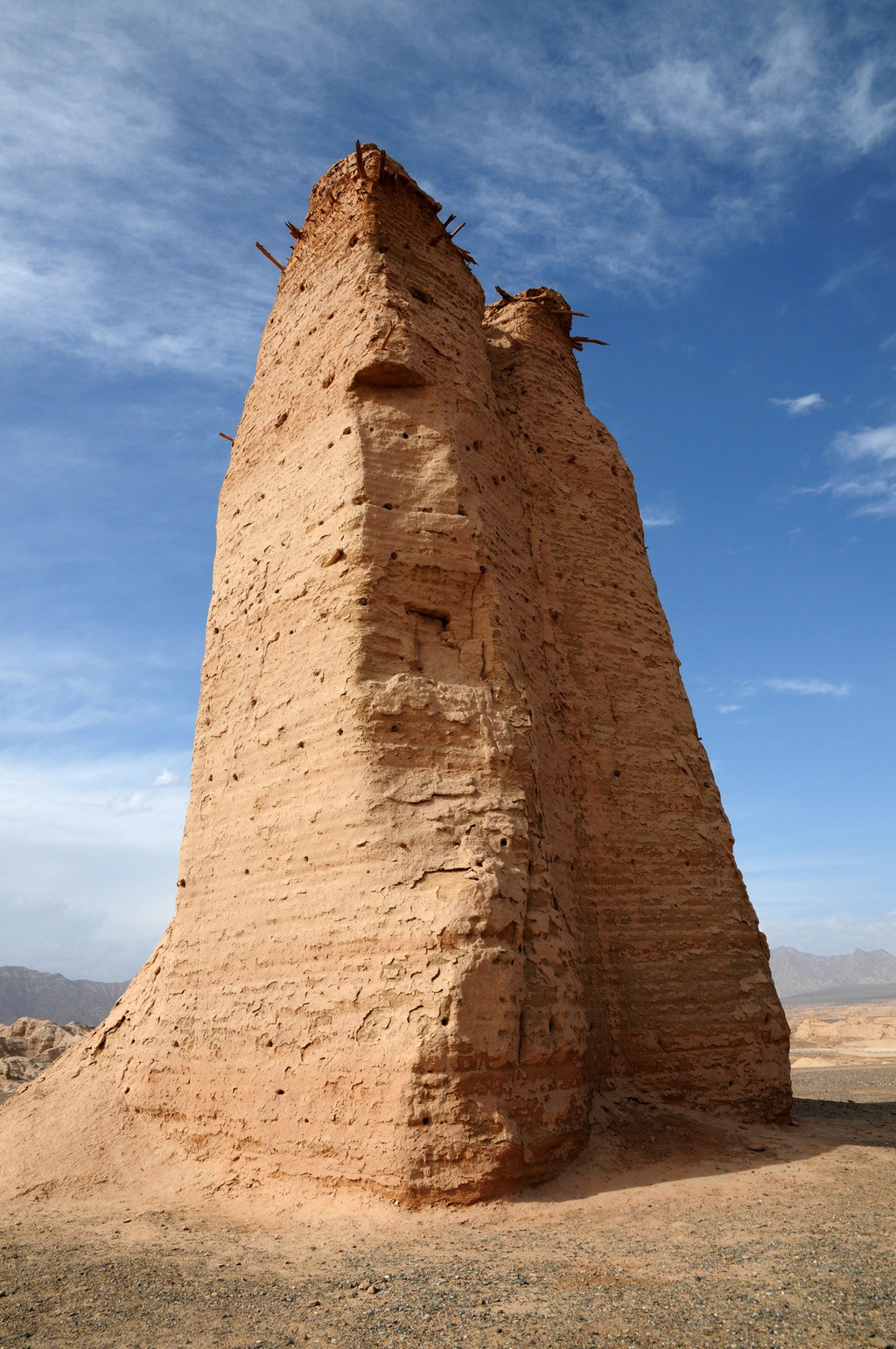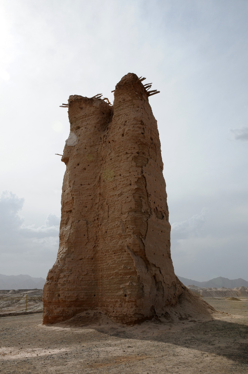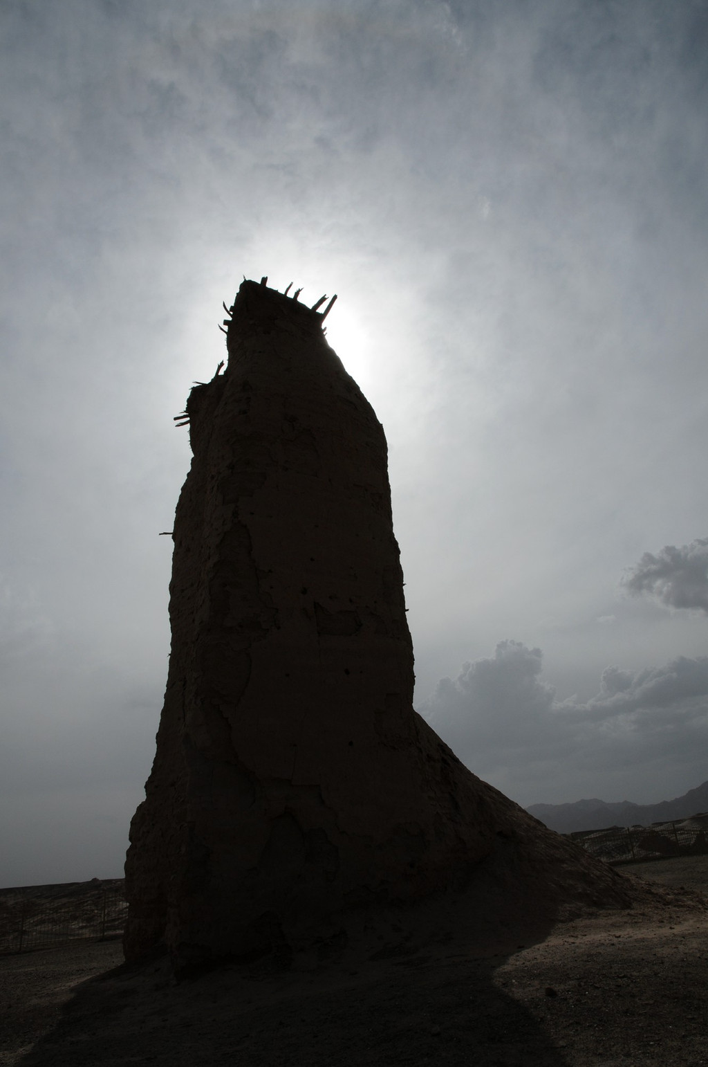 克孜尔尕哈烽燧离库车县城不远,在城北12公里处的库车河边,烽燧背倚却勒塔格山,面朝库车绿洲,深居盐水沟谷,烽燧的四周是一片比较平坦的黄土地,四、五层楼高的烽燧便显得特别突出。烽燧的烟火已经熄灭了千年,用天空中的云作为背景,遥想一下当年的烽烟。