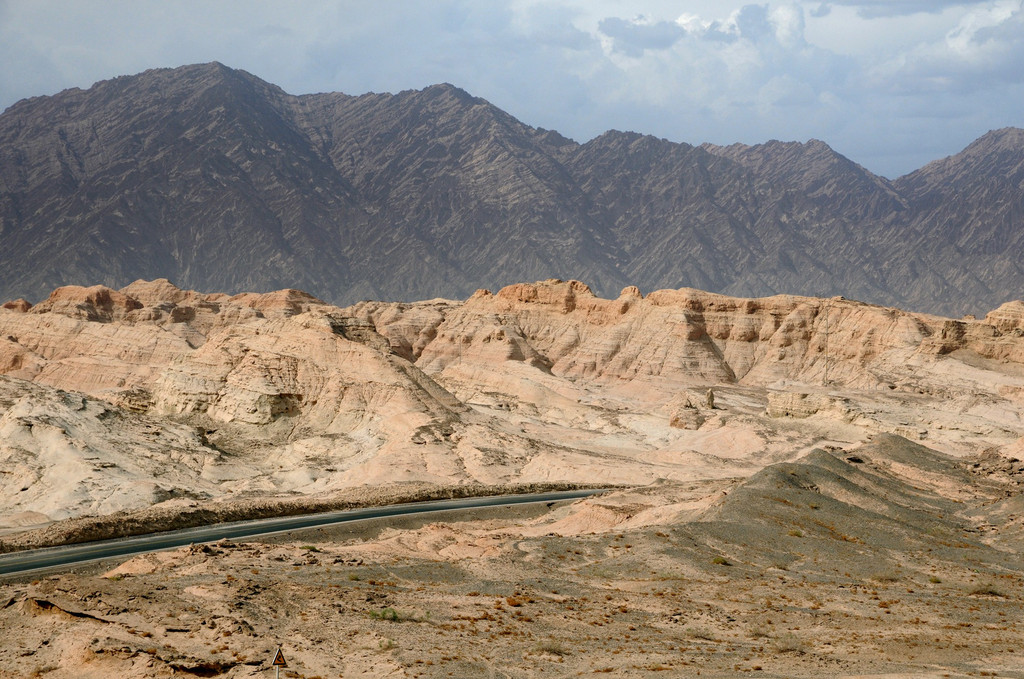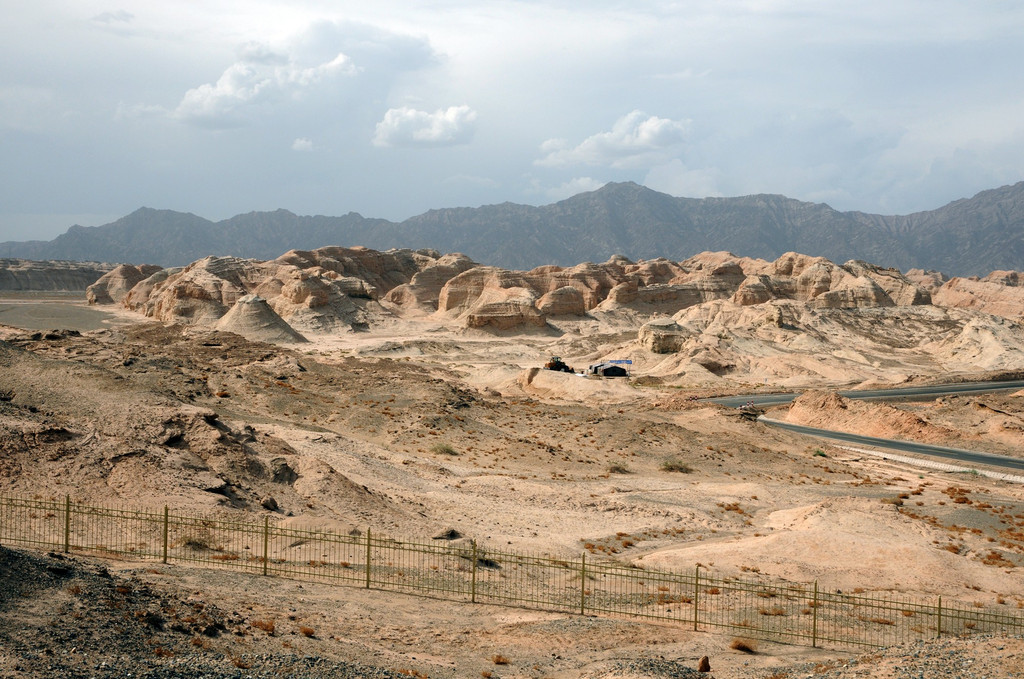 距离烽燧不远,有一处雅丹地貌很有特点,里面有工人和工程车辆正在施工,听说著名的克孜尔尕哈石窟就在这里,可惜路没修好,也没有向游客开放,还不能进去。 相关资料显示: 克孜尔尕哈石窟位于新疆库车县西北十四公里的山沟中,与克孜尔尕哈烽隧毗邻。周围一片灰白的风蚀雅丹地貌,鲜有植被(周边仅有守护者种植的两棵榆树),远离人烟,至今未通水、电。