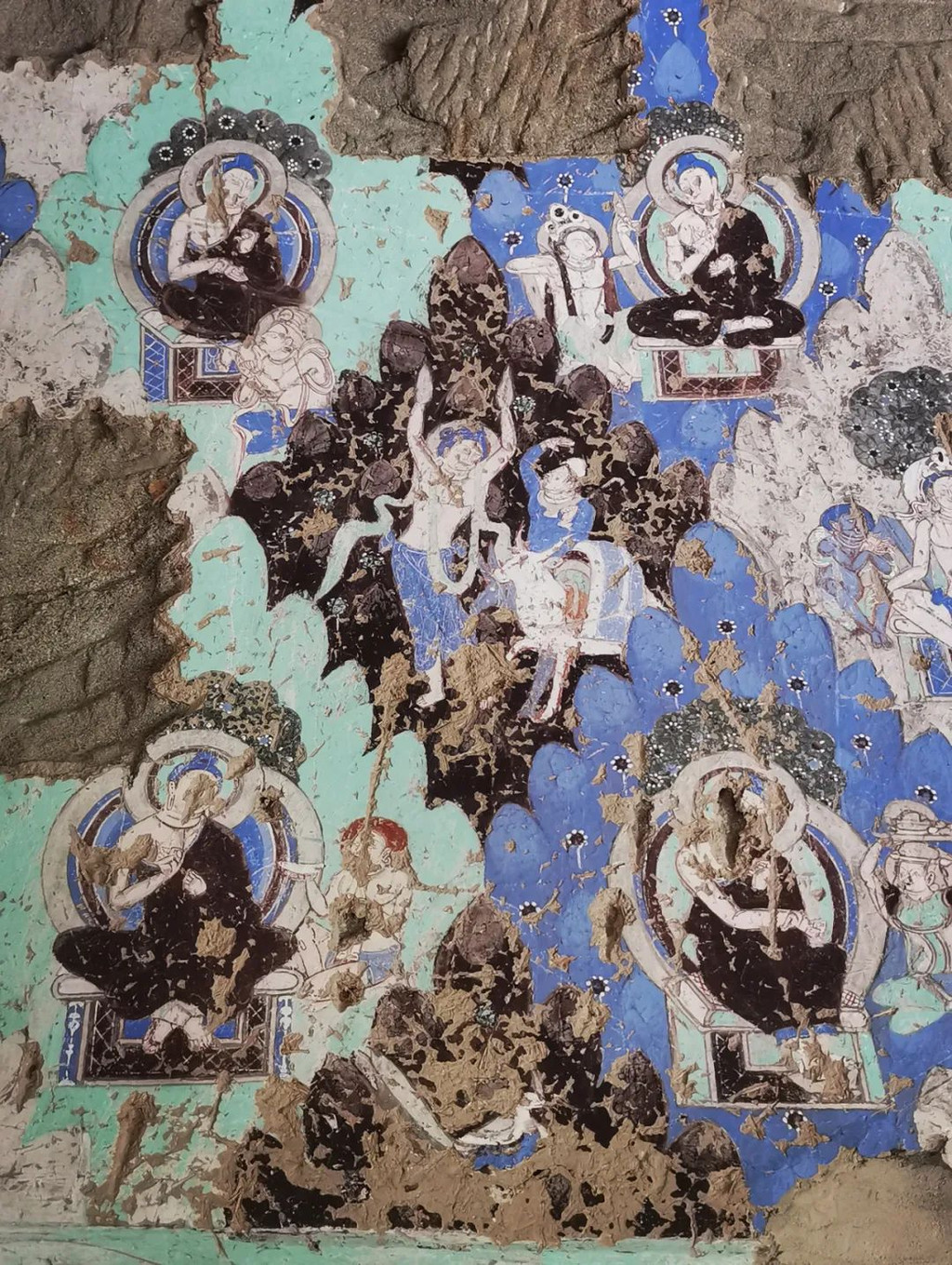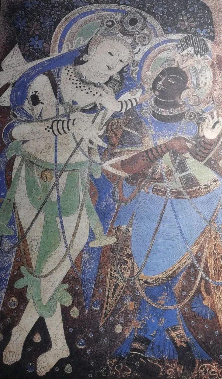 下图为克孜尔石窟171窟的壁画《乐神善爱乾达婆王》。龟兹石窟壁画继承了犍陀罗、马图拉(属古印度)等佛教艺术,又融合了中西亚艺术,形成了独特的绘画风格,以铁线勾勒画面轮廓,以晕染法表现肌肤,色彩多以石蓝、石绿、红、白交错列置,画面丰富艳丽,构图对称,人物形象生动精美。