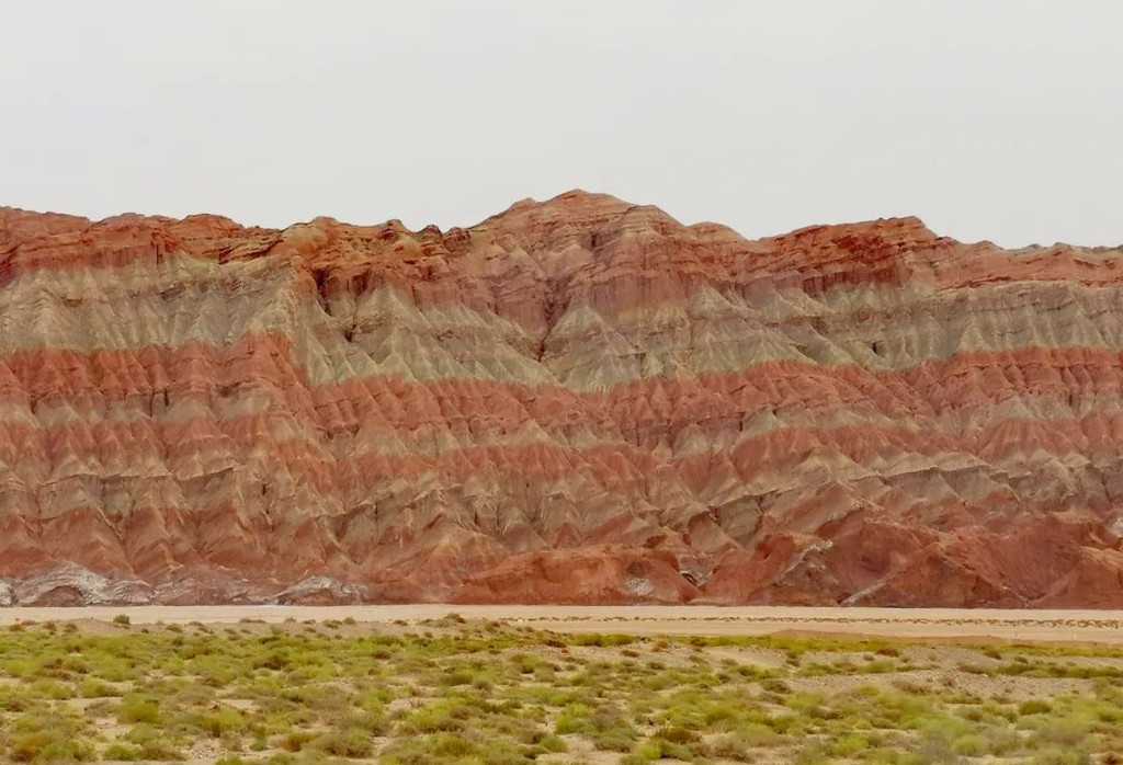 进入拜城县境后路边看到一座五彩山,此为雅丹地貌。褶皱的山体色彩丰富,有岩黄、砂岩红、赭红、绛紫......深深浅浅,层层叠叠,绵延起伏,一气呵成。