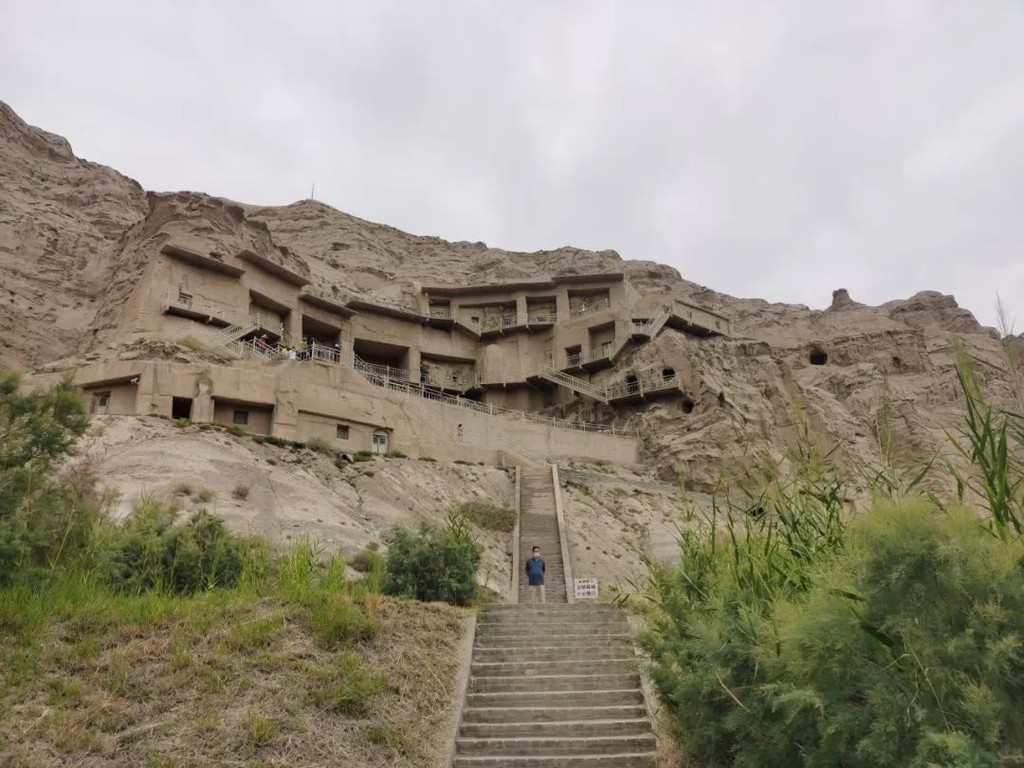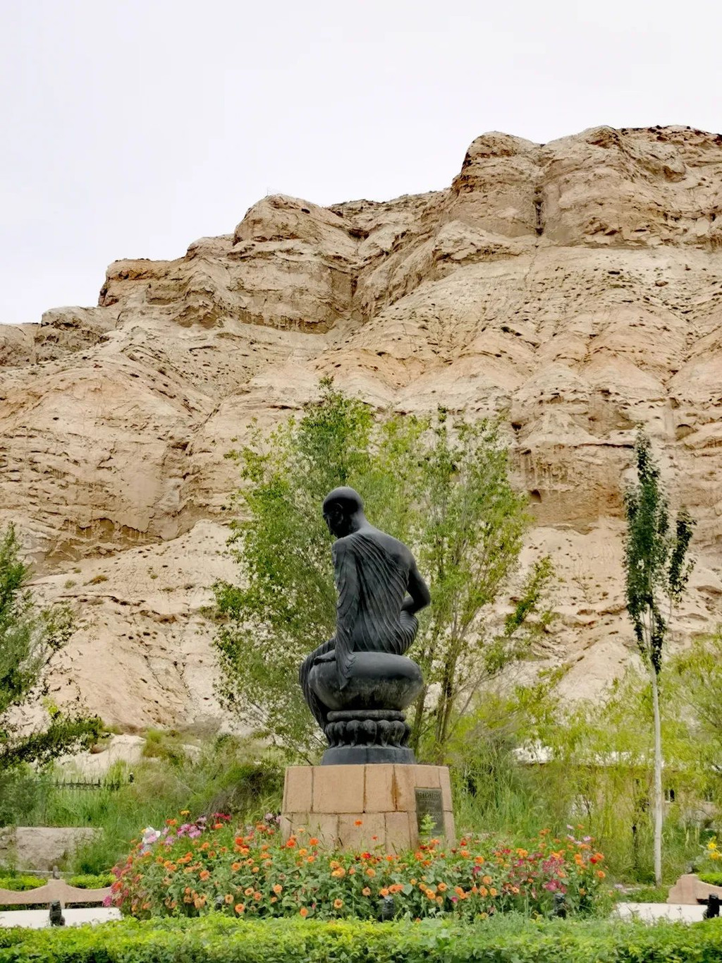 石窟外有鸠摩罗什的雕塑。鸠摩罗什原籍印度,其父鸠摩罗炎出身天竺望族,后至龟兹,生罗什。罗什7岁随母出家,初学小乘,后遇莎车国大乘名僧,改学大乘。他博读大小乘经论,名闻西域诸国,在汉地也有传闻。前秦建元十八年(382)苻坚遣吕光攻伐焉耆,灭龟兹,将罗什劫至凉州。三年后姚苌杀苻坚,灭前秦,吕光割据凉州,罗什随吕光滞留凉州达十六、七年。后秦弘始三年(401)姚兴攻伐后凉,亲迎罗什入长安,以国师礼待,并在长安组织了规模宏大的译场,请罗什主持译经事业。之后十余年间,罗什悉心从事译经和说法,共译出《大品般若经》、《妙法莲华经》、《金刚经》等三十五部二百九十四卷经书,其翻译文义圆通、内容信实、字句流畅,在中国译经史上有划时代的意义。鸠摩罗什曾两次被迫“破戒”,遭遇逼婚,这一度让他陷入精神痛苦,但他并没有因此沉沦红尘,而是将佛学研究进行到了生命的最后。