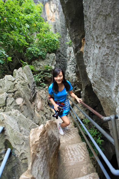 首先进入的就是所说的“大石林”景区大石林的石头很密集,左转右扭的,顺着台阶开始爬山了据说能看到石林的全景(跟着一个导游走,不吃亏,要不石林内300多个岔路口会迷路的)