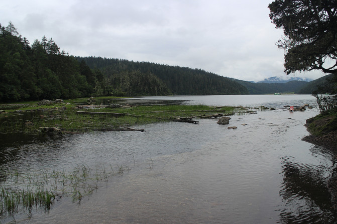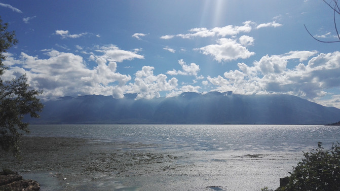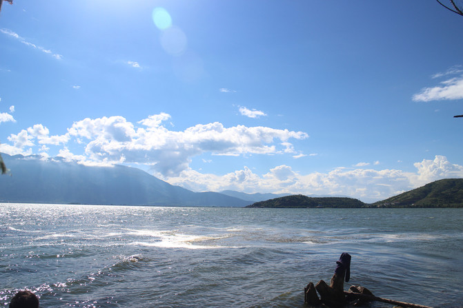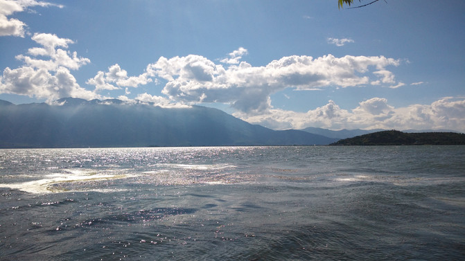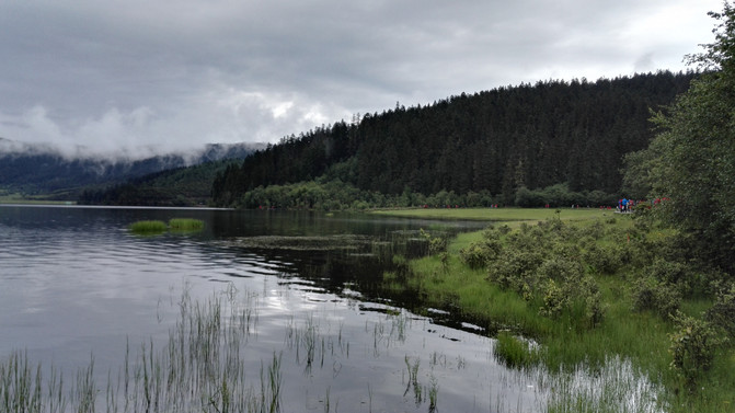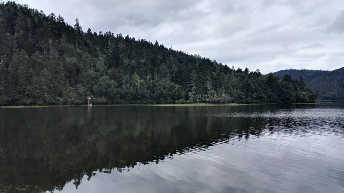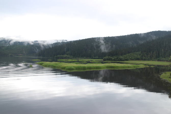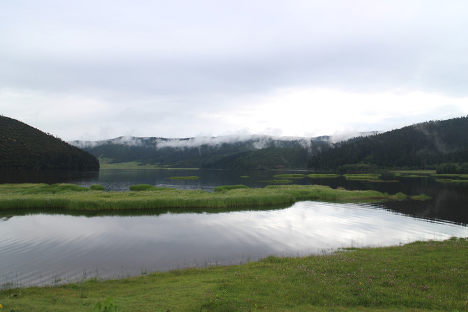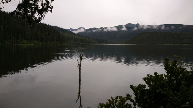 湖岸四周植被繁茂,远处雪峰映衬。湖水是透明的蓝,近乎凝固的湛蓝中些许的绿意点缀其间。于湖心四顾,白云连横,浮于山际,倒映在湖面,如梦幻影,疑是仙境。