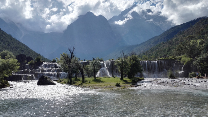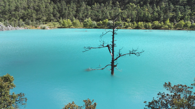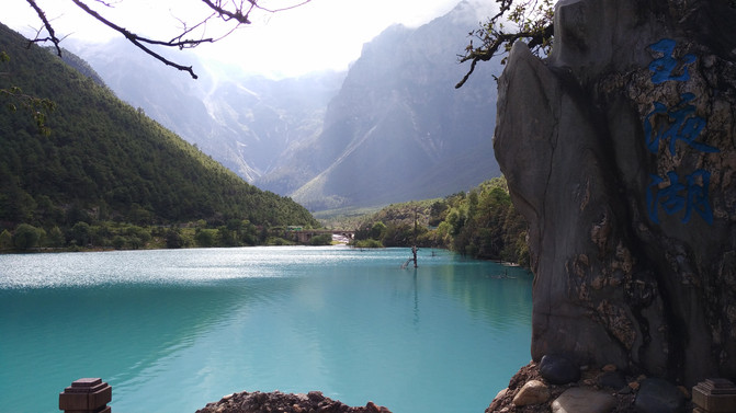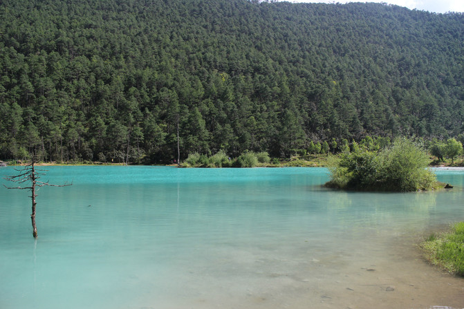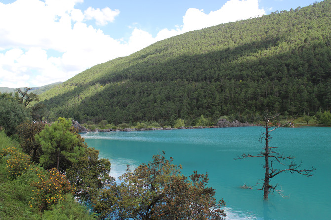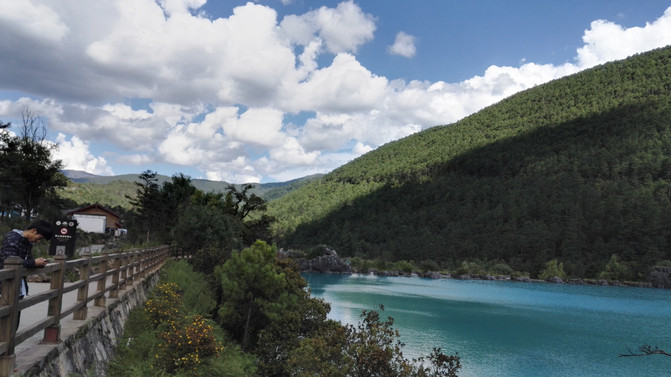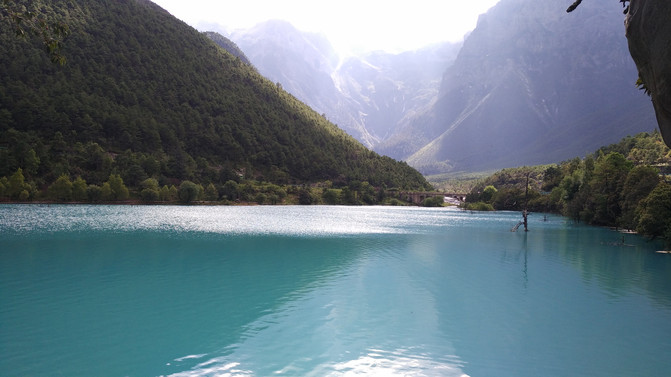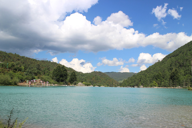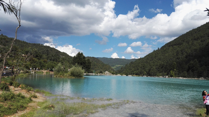蓝月谷,其前身为早前人们所熟知的"白水河"。在晴天时,水的颜色是蓝色的,而且山谷呈月牙形,远看就像一轮蓝色的月亮镶嵌在玉龙雪山脚下,所以名叫蓝月谷。而白水河这个名字是因为湖底的泥巴是白色的,下雨时水会变成白色,所以又叫白水河。