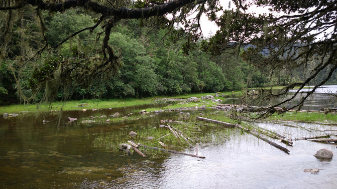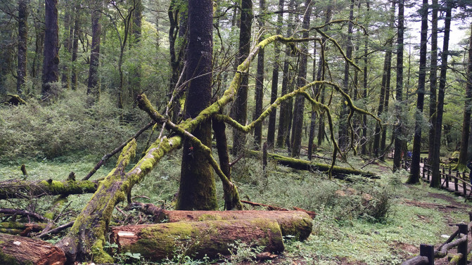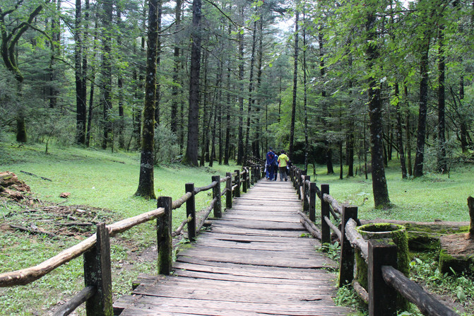 下了缆车我们便置身于一片原始森林之中。穿越原始森林的路为木板搭成,左右有护栏,上下有阶梯,蜿蜒伸向森林的尽头。这种木板路别具一格,它由栗木铺成,形如栈道,故名云杉栈道。漫步在栈道上,清新的空气沁入心脾,让人心旷神怡,此刻,仿佛人生所有的不快与烦恼都消逝殆尽。栈道两旁高耸直立的云杉一棵连着一棵,深秋的阳光穿过树林的缝隙,把长满青苔的林地镀上一层金黄。这里既有青枝绿叶、树木参天,又有枯枝倒挂、腐木横呈。随处可见树枝上的青苔如胡须垂挂,倒伏堆积的树木被青苔覆盖,俨然是一座座苍凉悲怆的坟茔。岁月的沧桑在这里弥漫凝固,似乎千百年都没人来打扰过,一个天然原生态的伊甸园。