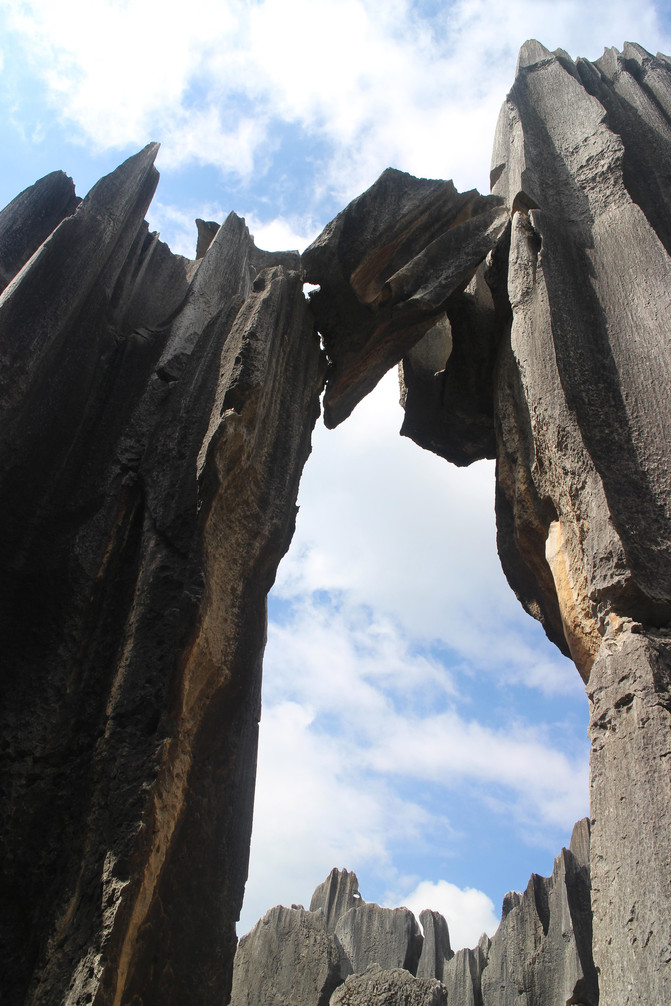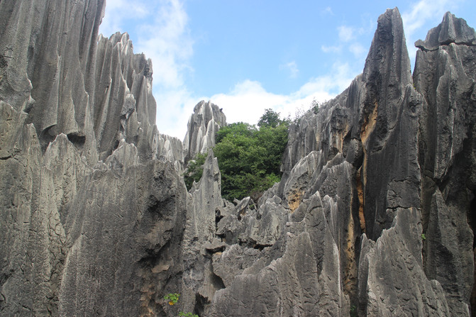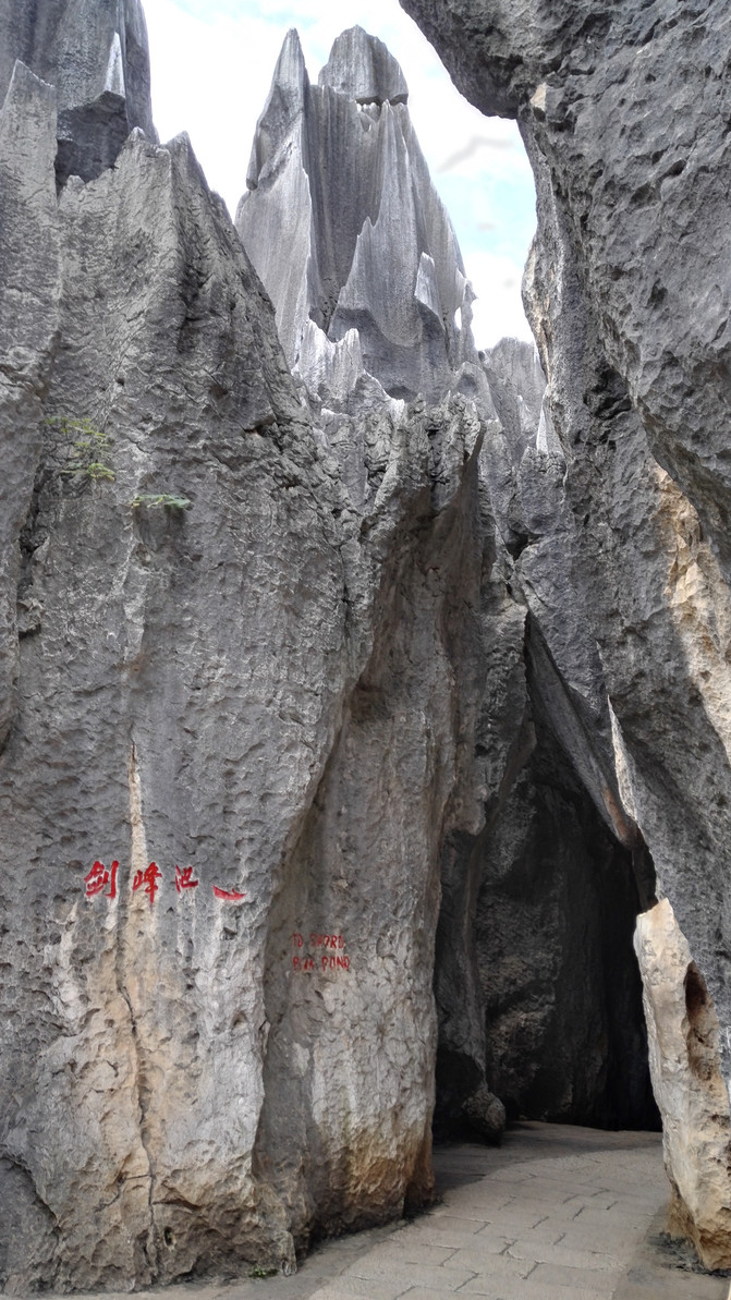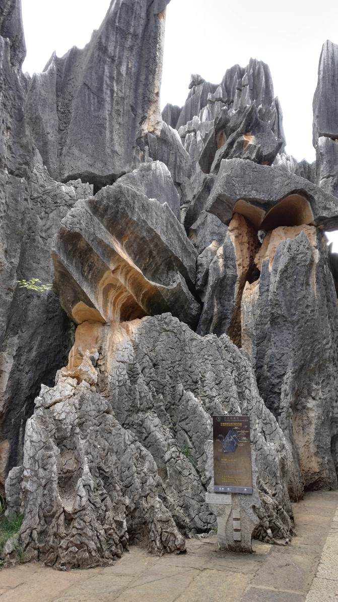 石柱经雨水长期的垂向溶蚀,表面呈现锋利的刃和凹槽(溶痕),形如宝剑,直刺天穹,称为剑状石柱。石柱中下部有近水平方向的溶蚀凹面,是石柱还埋在土下时,地下水流动的痕迹,石柱表面还有细小溶窝,主要是生物溶蚀作用所致。