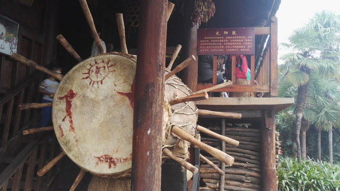 基诺族太阳鼓——基诺族的大鼓长约1米左右,直径在四、五十厘米之间,两面蒙有牛皮,平时禁止敲击,只有在过特懋克节和祭祀称为"铁罗嫫嫫"的神灵时,方能敲击大鼓和跳大鼓舞。