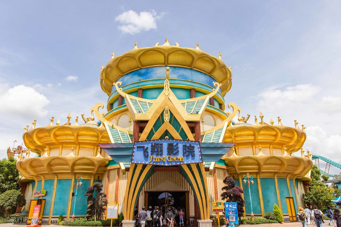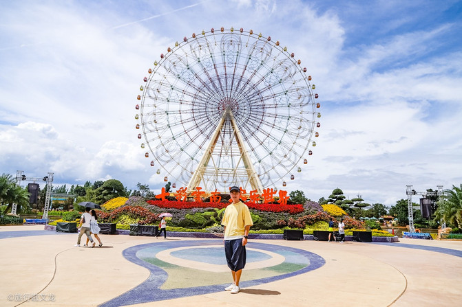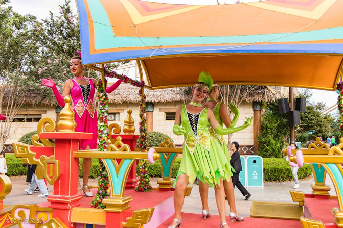 来这里赶上了盛夏狂欢季,外国乐队欢迎宾客穿上富有异域风情的服装,用不同的乐器演奏着欢迎曲,曲调铿锵有力。一个个也是精神抖擞和面带笑容。身后孔雀的造型依托着摩天轮,就犹如孔雀开屏一般。孔雀造型旁边有各种各样花开着,在视觉上产生了美感。