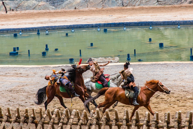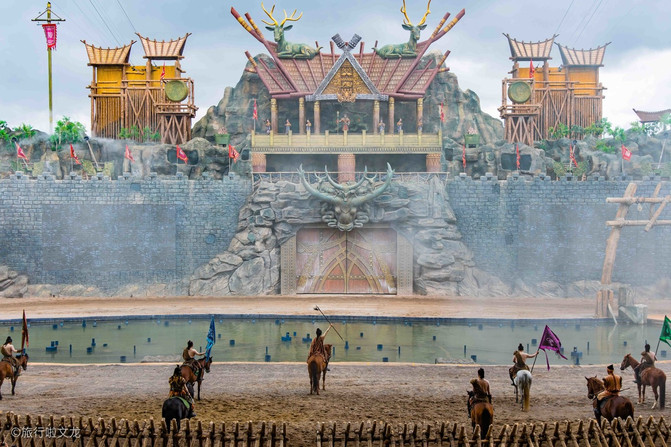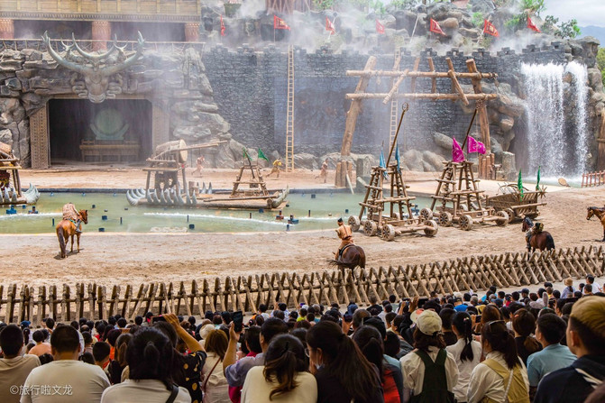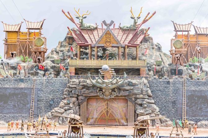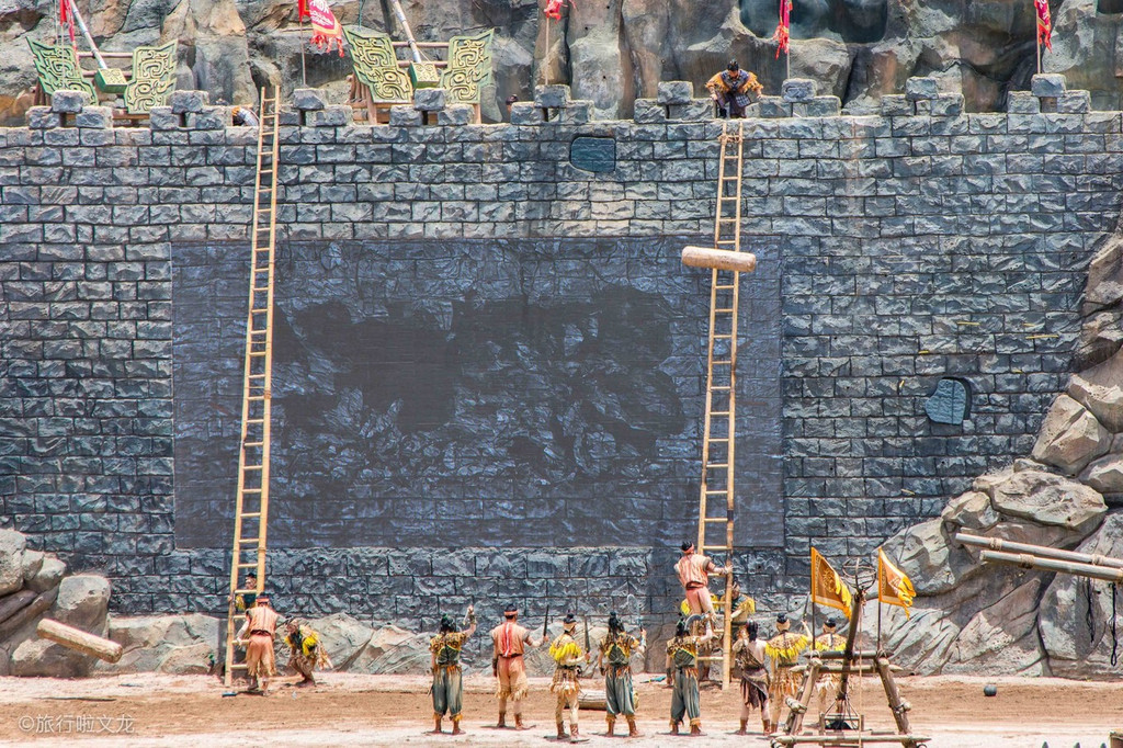 在剧情的高潮,便出现了第三幕,烽火狼烟,摧城拔寨,上演了各类大型的兵器的刀光剑影,各种兵器轮番上阵,在水火声光电的特效配合下,上演着惊心动魄的攻城场景。