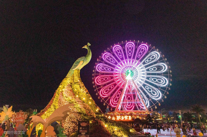 夜晚的欢乐世界变了一个模样,在五彩斑斓的灯光点缀一下,更加的绚丽多彩。最吸人眼球的便是摩天轮的造型,在灯光的点缀下,将孔雀开屏展现的淋漓尽致。当然灯光不是一成不变的,是在时刻变化着的,灯光的不同给人们的感受也是不同的。