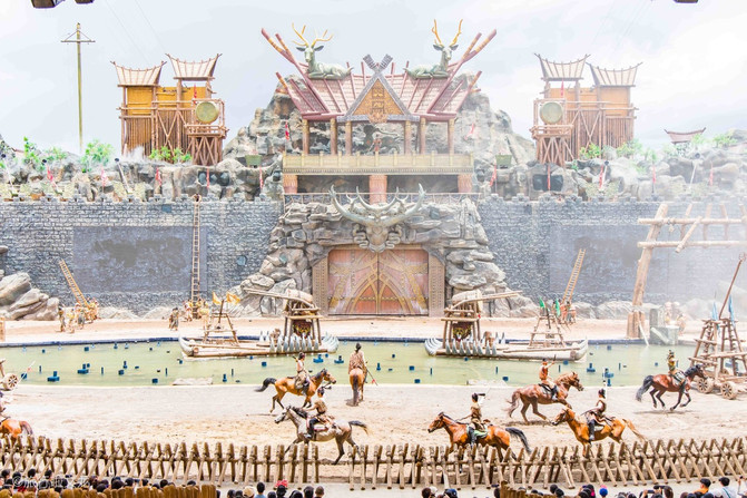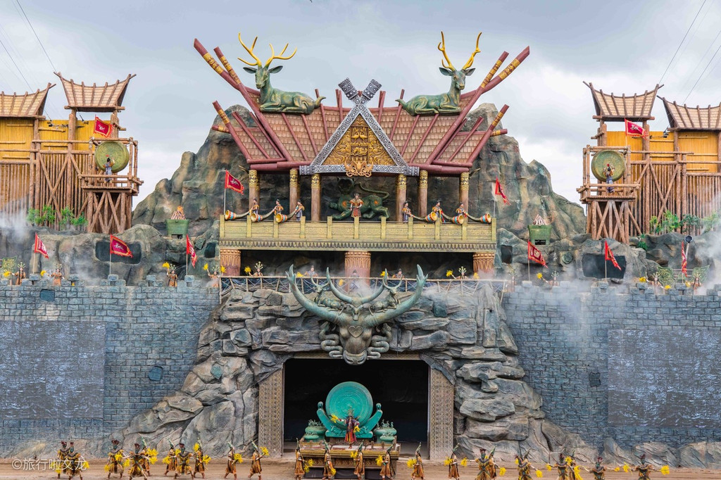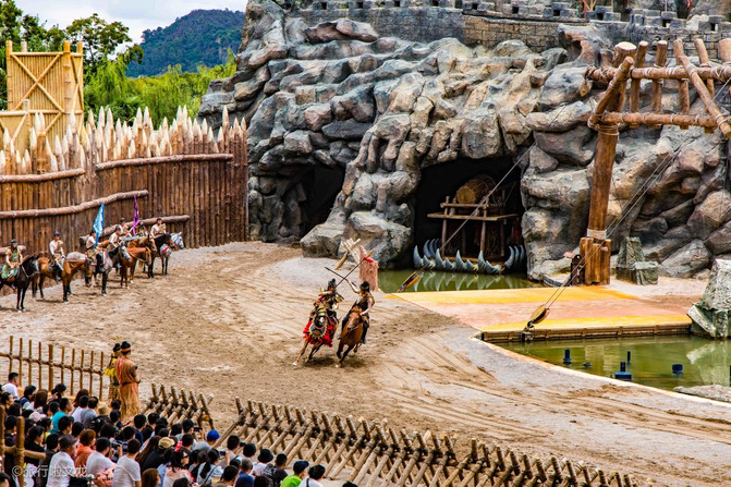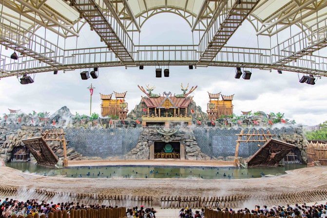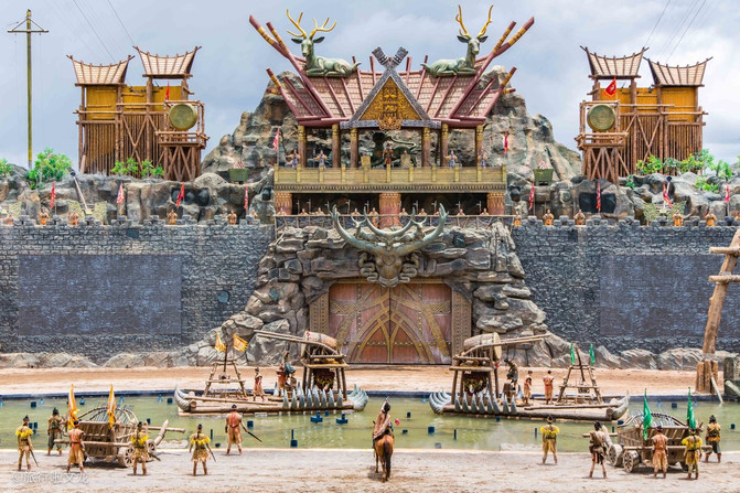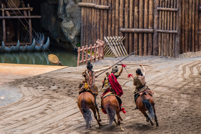 在 云南 欢乐世界我有幸现场欣赏了古滇特技剧场的剧目《古滇风云录》,该剧目是以两千年前西汉时期的古滇国和周边部族战争为背景的特效实景大战。剧场占地面积非常大,场地足足可以容纳2000多人,我去的时候人流真的特别多,剧场上有很多游客观看和拍照,热闹非凡。