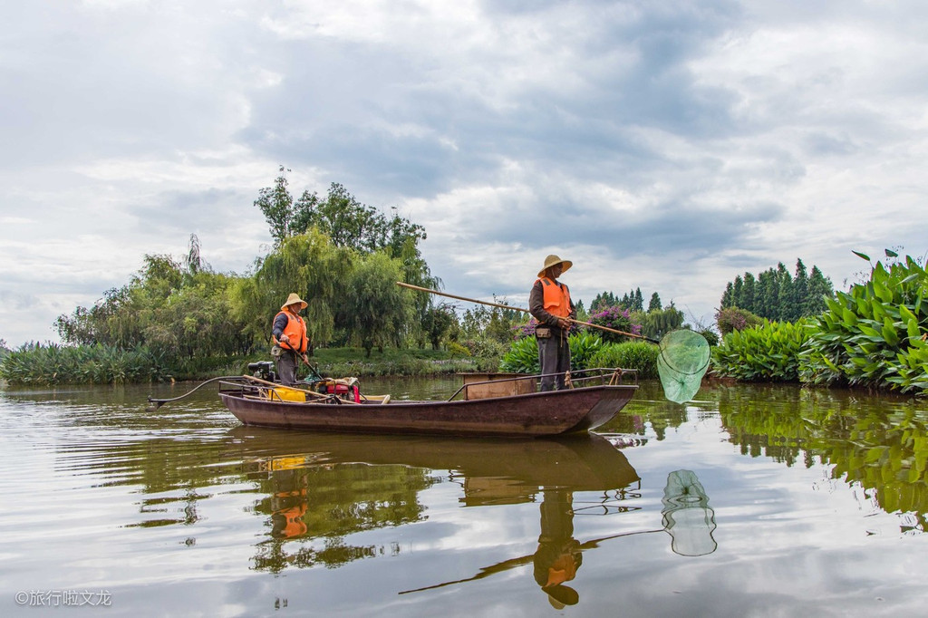 船的造型贴近古滇国“长脊短檐”的建筑风格,很符合 云南 特有的民族风情和古滇国所拥有神秘文化的内涵。游客们可游行的船叫滇海渔舟,而且还有编号,做工也很精细,就这样缓缓的向前移动着,很是惬意,微风徐徐的吹过脸颊,十分的凉爽。在江上还遇到了清理水面上的污渍的人,我们还去打了招呼,一口地道的 云南 话与我们交流着,虽说有些许的不懂,但是可大概知道,这地方的水质很不错,是他们细心的呵护。