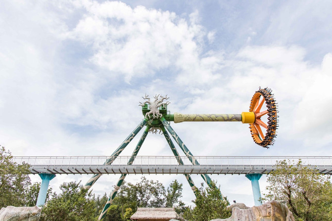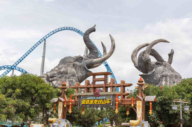 这里有着蓝色和红色的过山车,都有自己的名字,一个叫做象戏游龙过山车,另一个是雪鹰宽翼过山车。先来说一下蓝色的过山车,看到两个壮大的象头作为过山车的头,这样的大象造型就像两只在欢乐玩耍的大象,看来叫做象戏游龙过山车还是有一定的道理。站在旁边看了一下,这个过山车的速度好像比红色的还要快还要刺激。