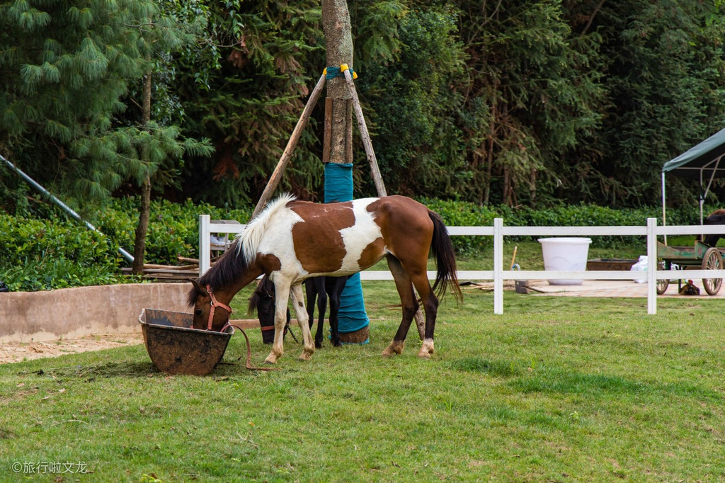这里的马也划分了一个区域,将它圈养在一处区域。也没有用绳子将它绑住。它就悠哉悠哉的在这个区域里吃着食物。身上白色和棕色让我想到了斑马,我们这样近距离的去拍它,它也就安详地在那里吃的食物,并没有对我们做出不好的反应。